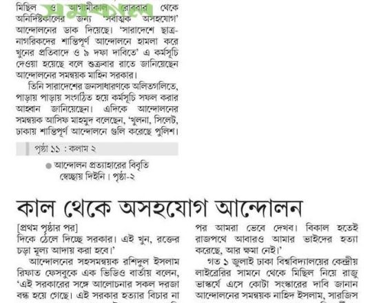 সমকাল, ৩ আগস্ট ২০২৪, কাল থেকে অসহযোগ আন্দোলন