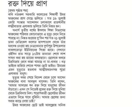 সমকাল, ৩ আগস্ট ২০২৪, রক্ত দিয়ে প্রাণ বাঁচানো উমর ফারুক রক্তেই ভাসলেন
