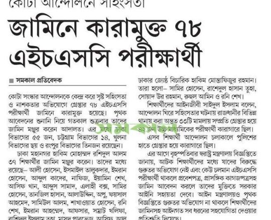 সমকাল, ৩ আগস্ট ২০২৪, জামিনে কারামুক্ত ৭৮ এইচএসসি পরীক্ষার্থী