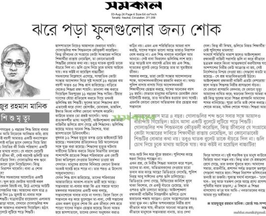 সমকাল, ৩ আগস্ট ২০২৪, ঝরে পড়া ফুলগুলোর জন্য শোক