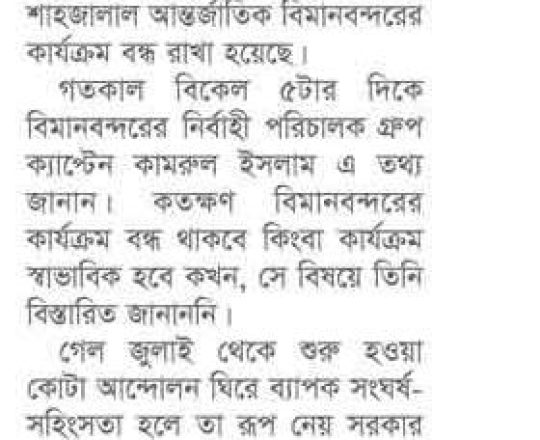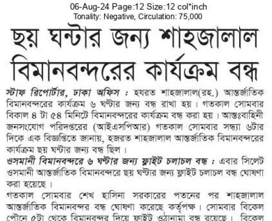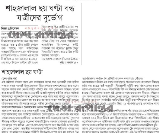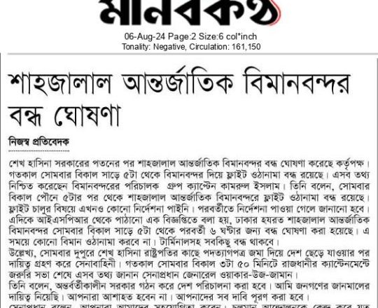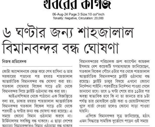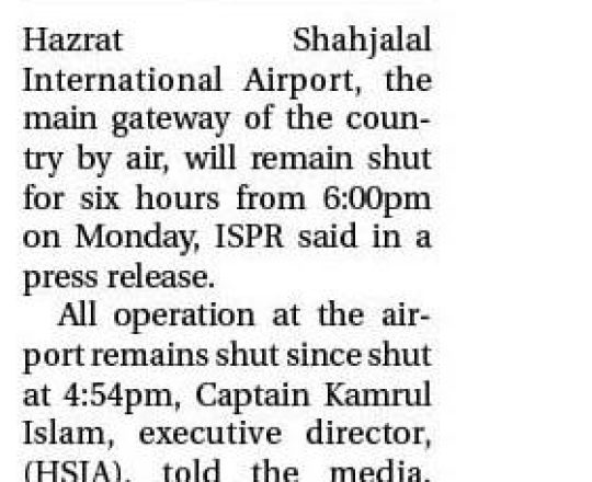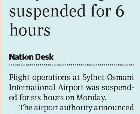 Business Post, 6 August 2024, Flight operation at Sylhet Airport suspended for 6 hours