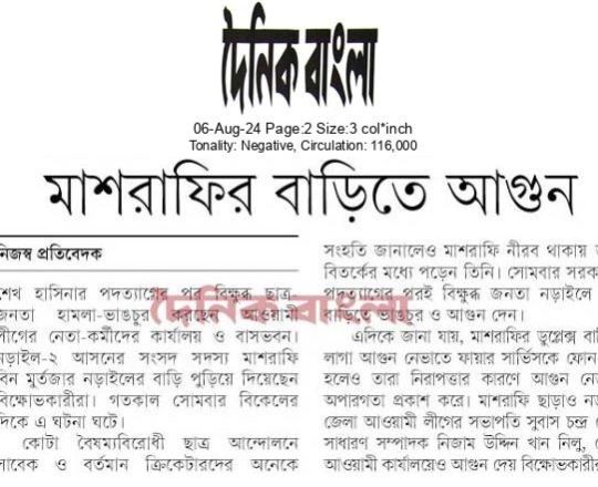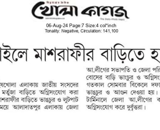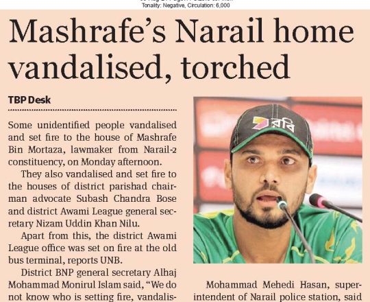 Business Post, 6 August 2024, Mashrafe's Narail home vandalised, torched