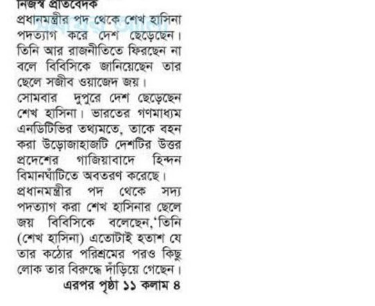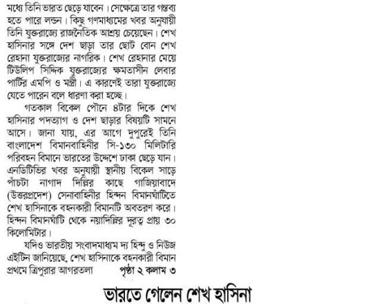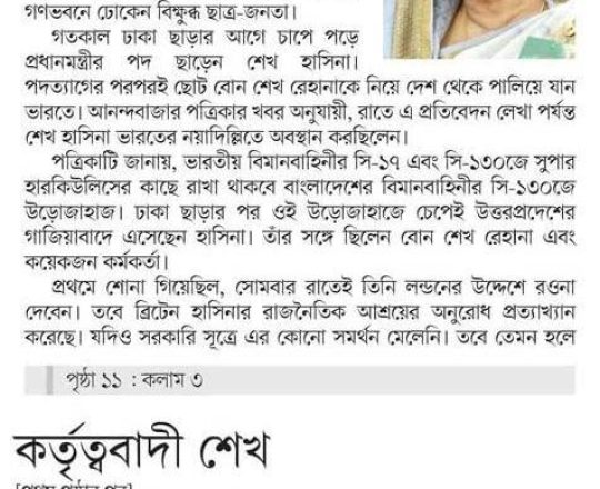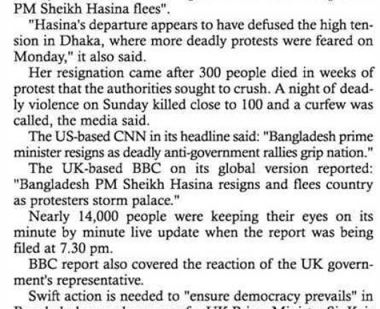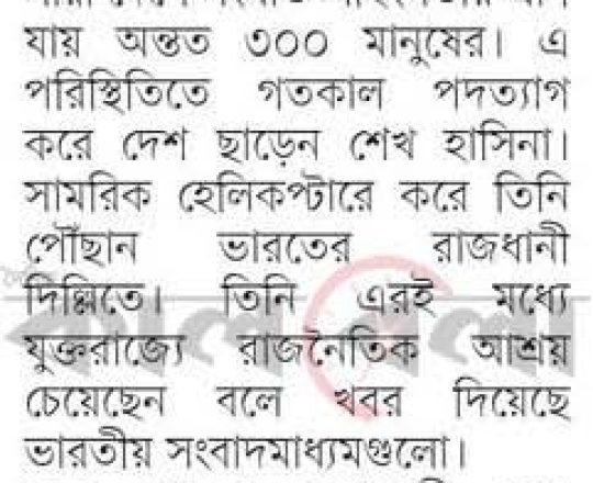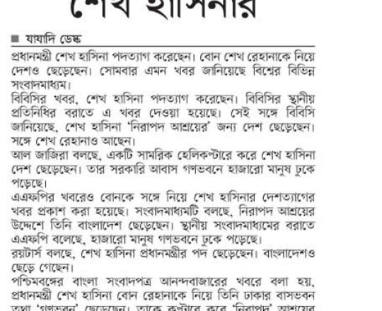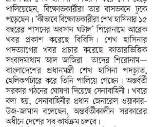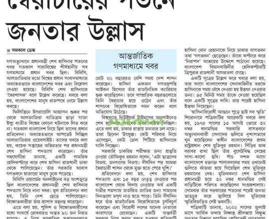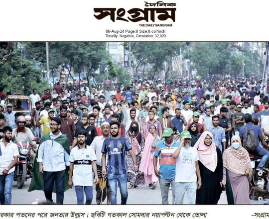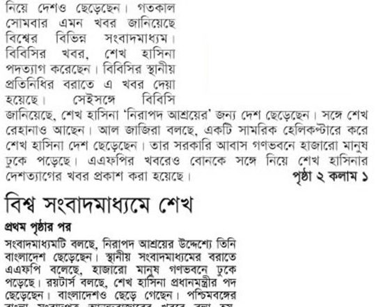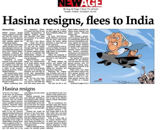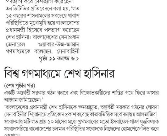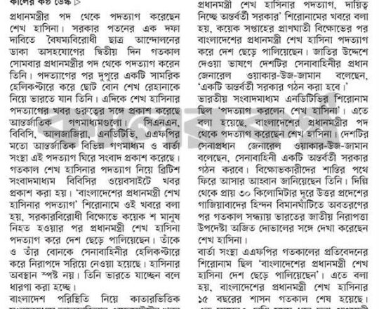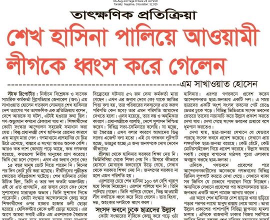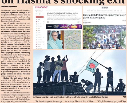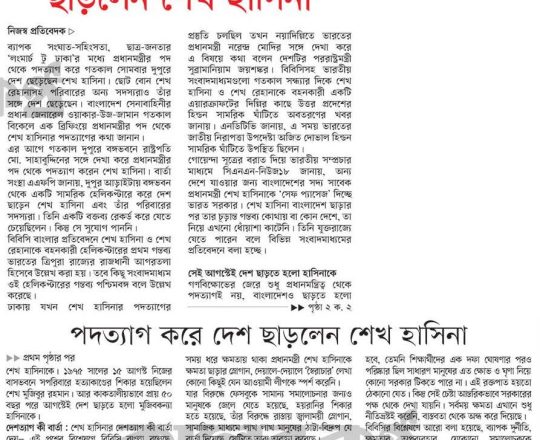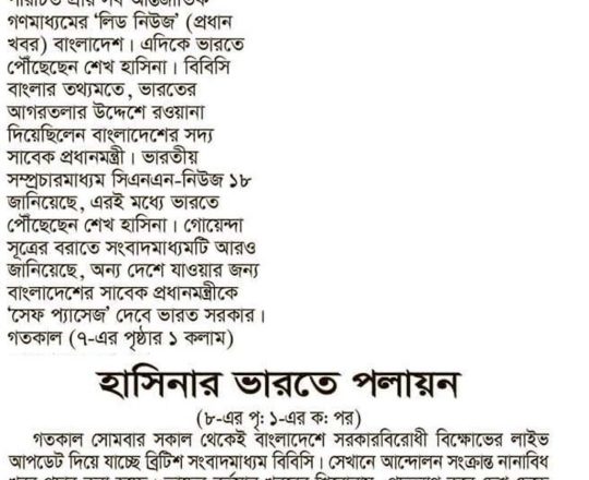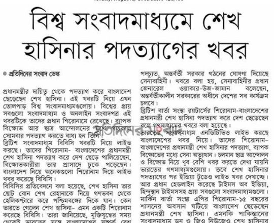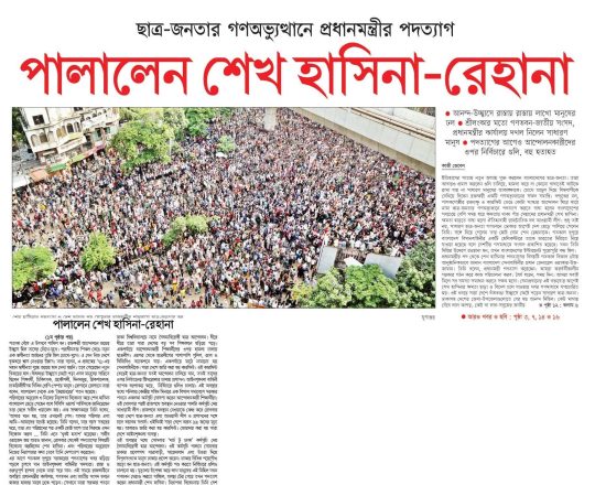 সংগ্রাম, ৬ আগস্ট ২০২৪, বিশ্বমিডিয়ায় তোলপাড় হাসিনার ভারতে পলায়ন