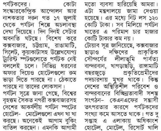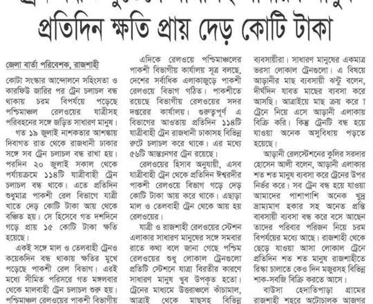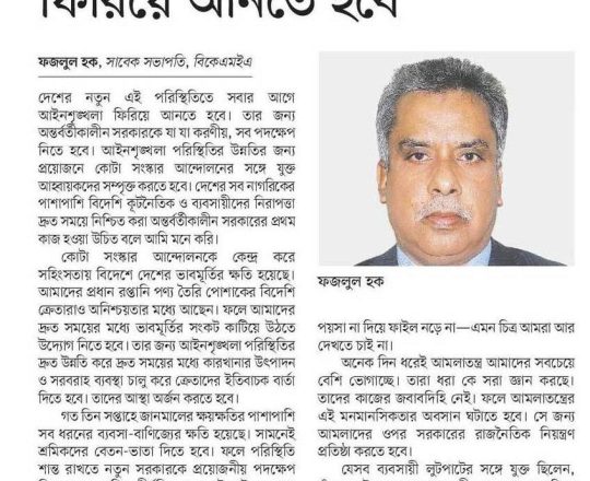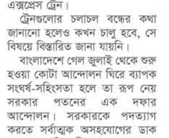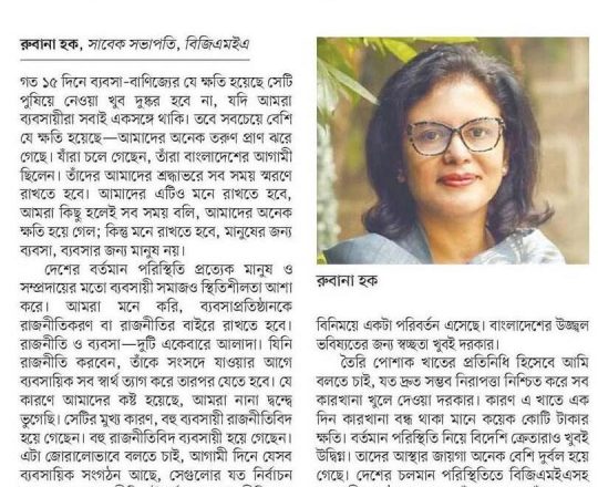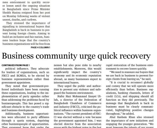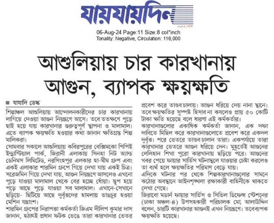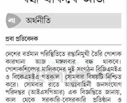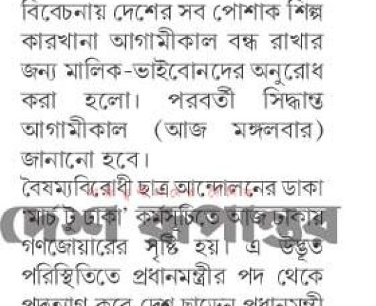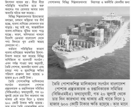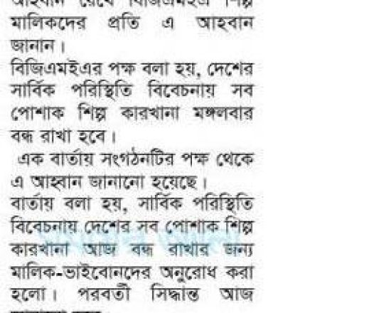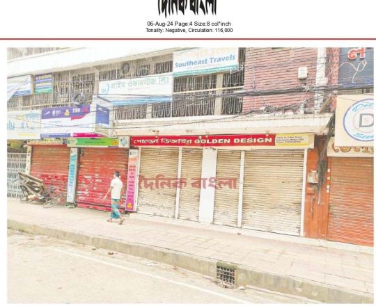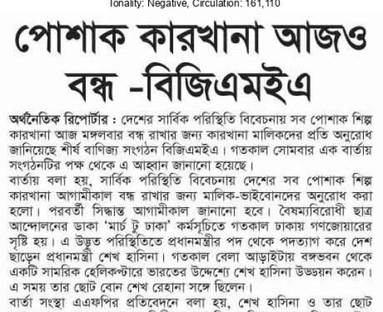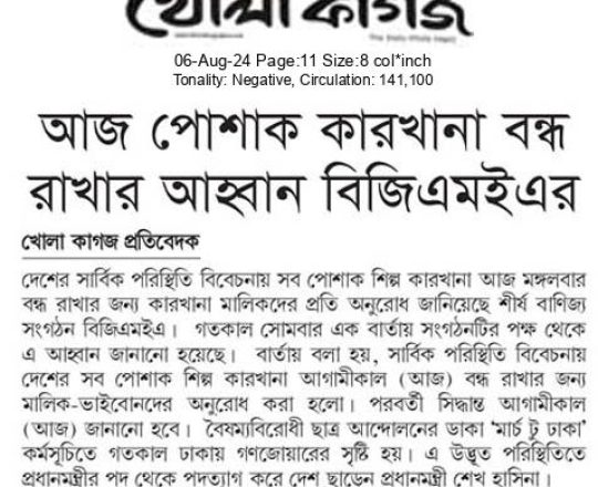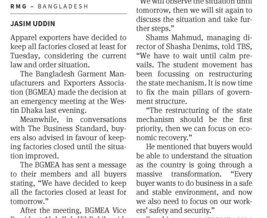Business Standard, 6 August 2024, RMG units to stay shut today