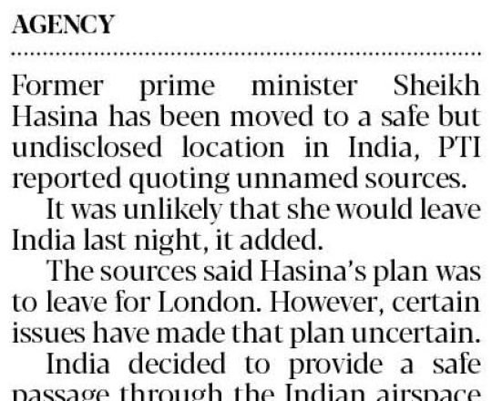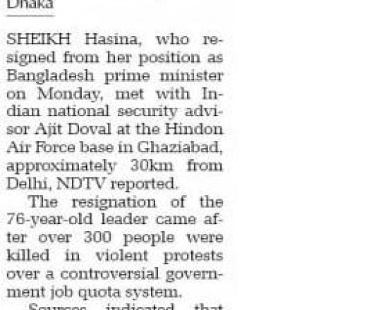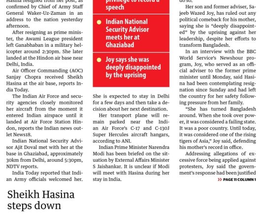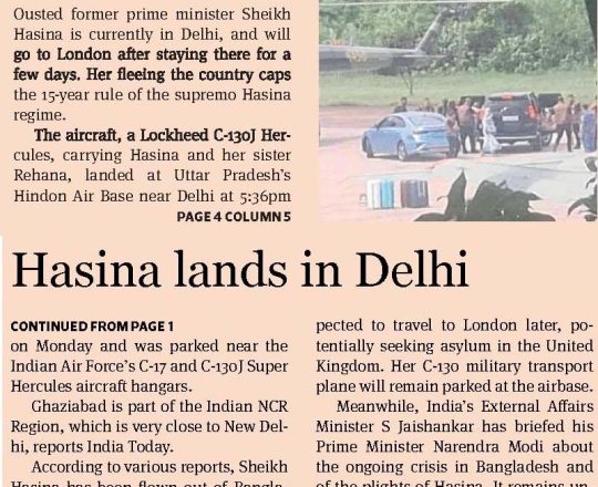 Business Post, 6 August 2024, Hasina lands in Delhi, en route to London: Sources