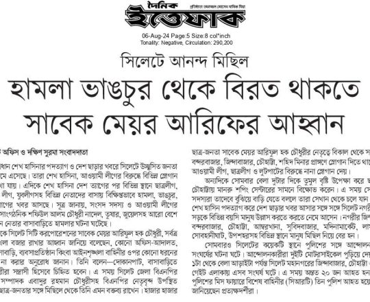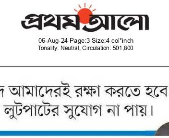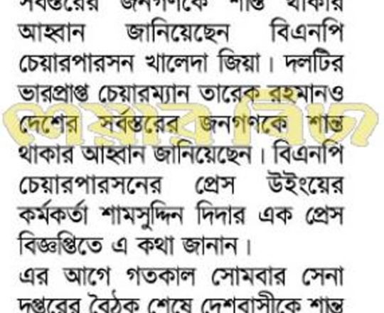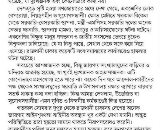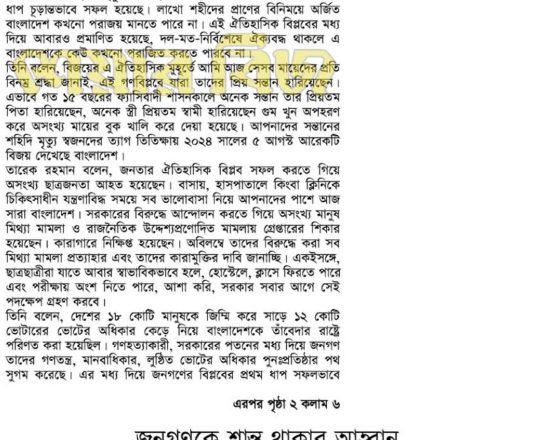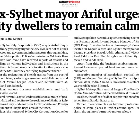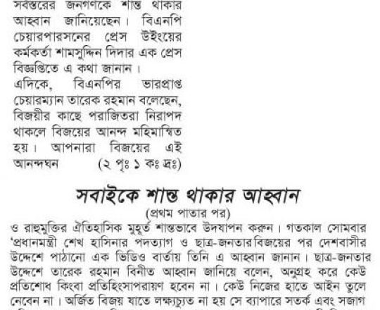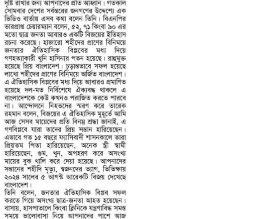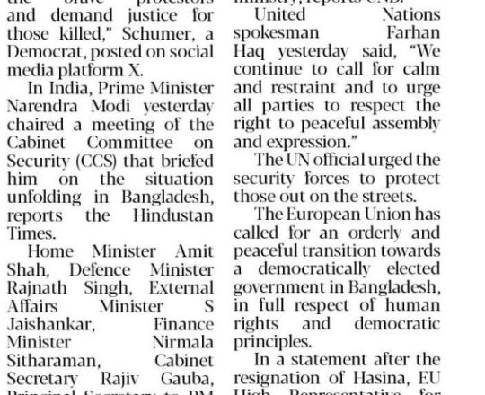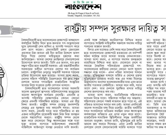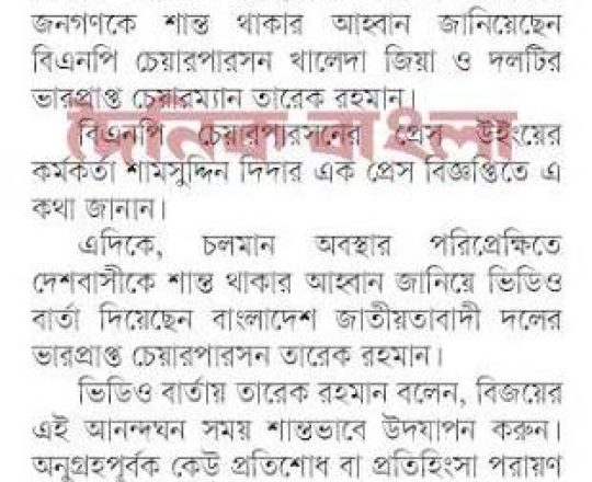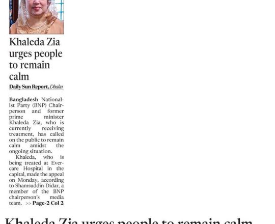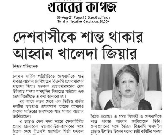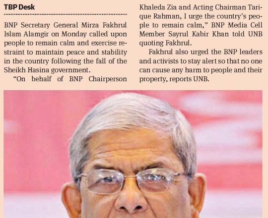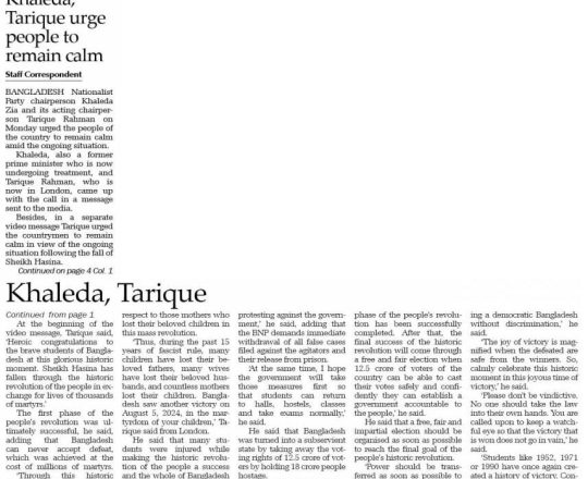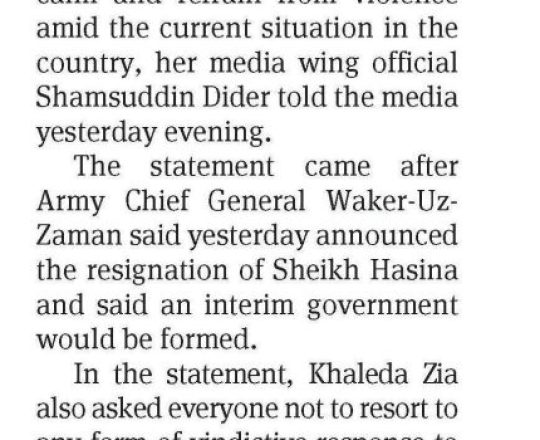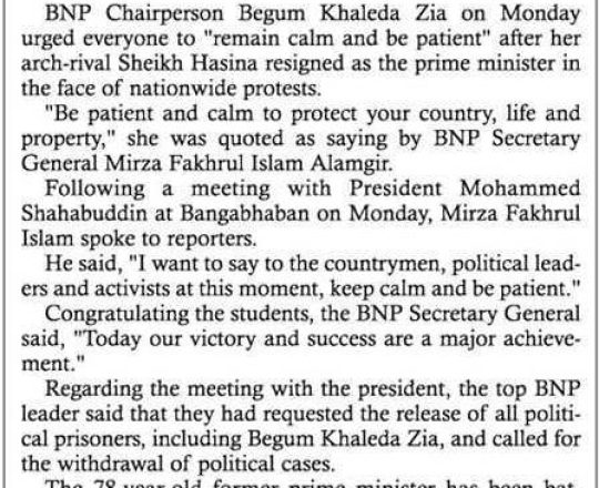 Business Standard, 6 August 2024, Khaleda urges countrymen to remain calm, refrain from violence