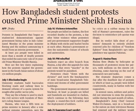 Business Post, 6 August 2024, How Bangladesh student protests ousted Prime Minister Sheikh Hasina