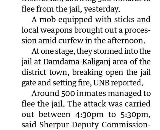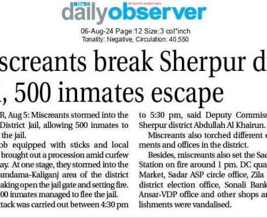 Daily Observer, 6 August 2024, Miscreants break Sherpur dist jail, 500 inmates escape