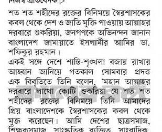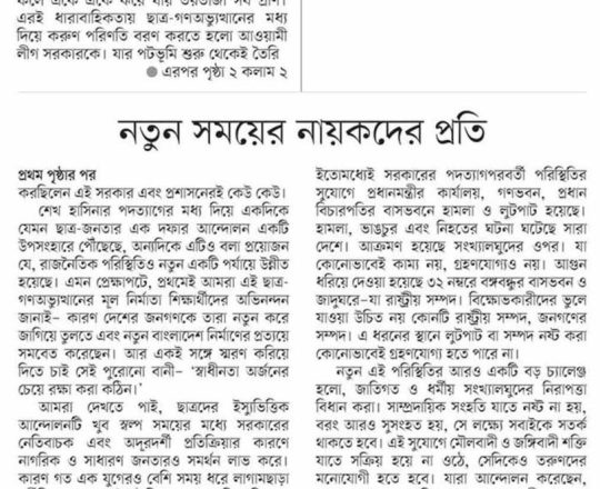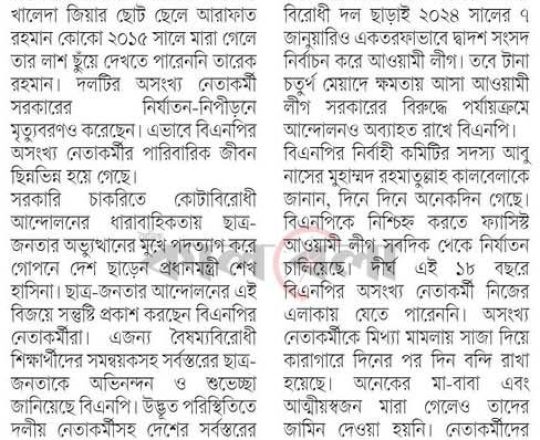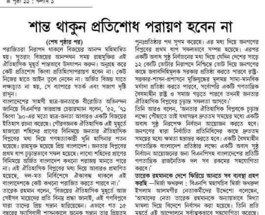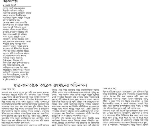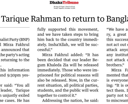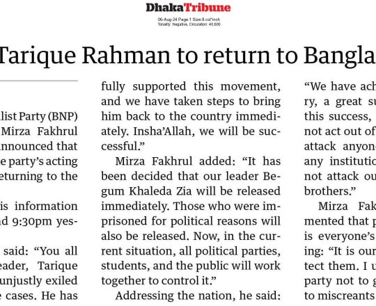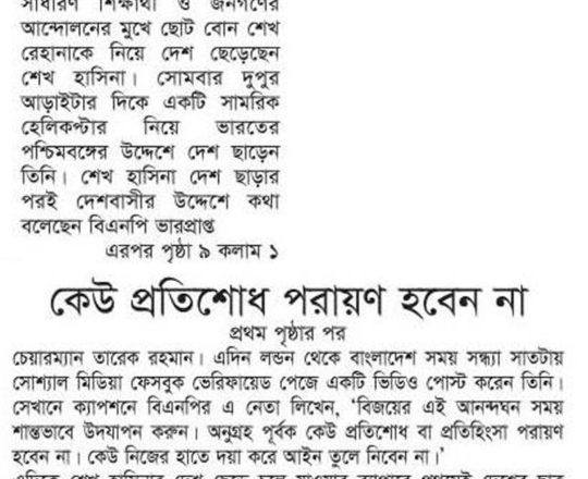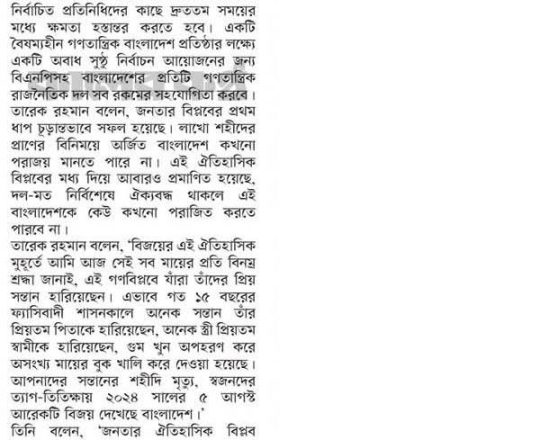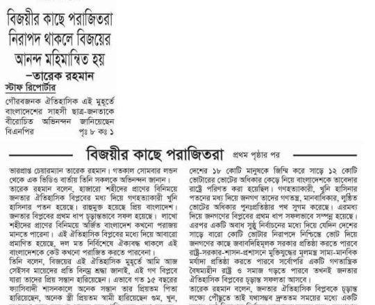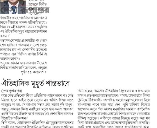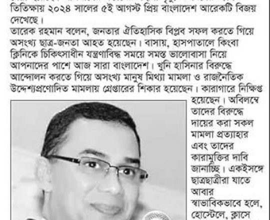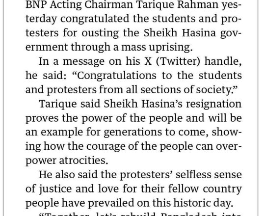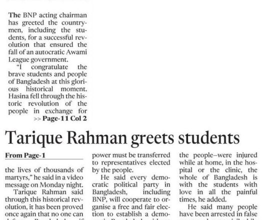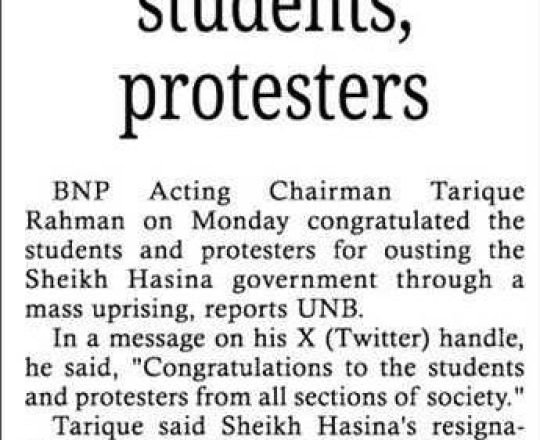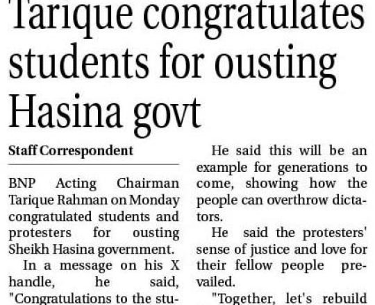 Daily Observer, 6 August 2024, Tarique congratulates students for ousting Hasina govt