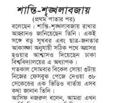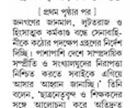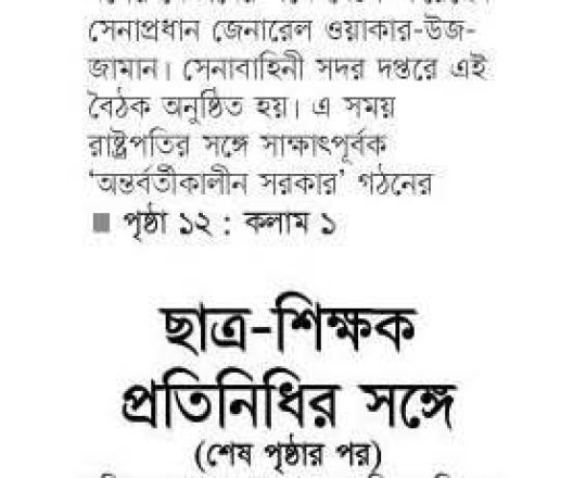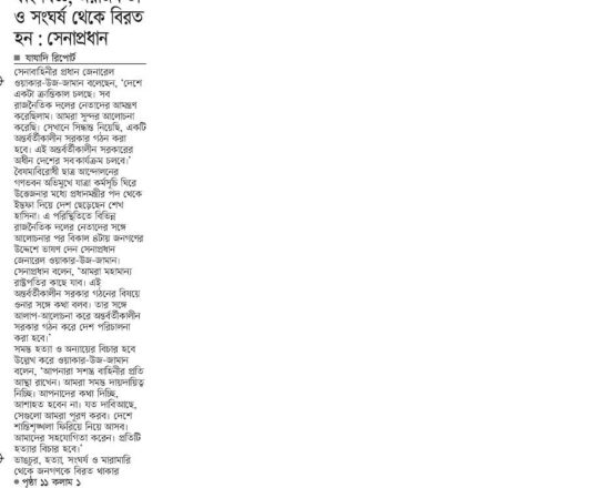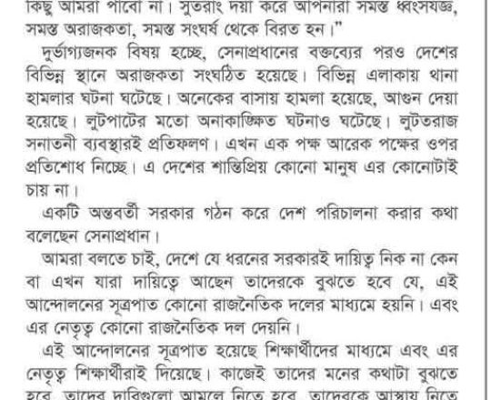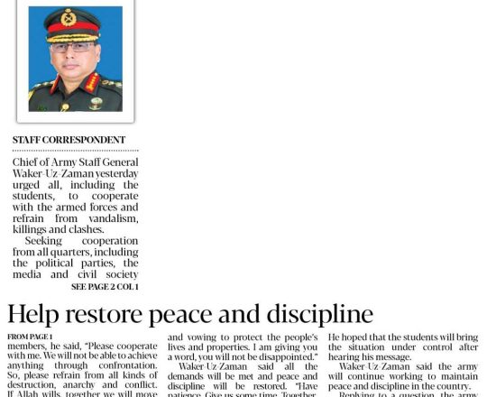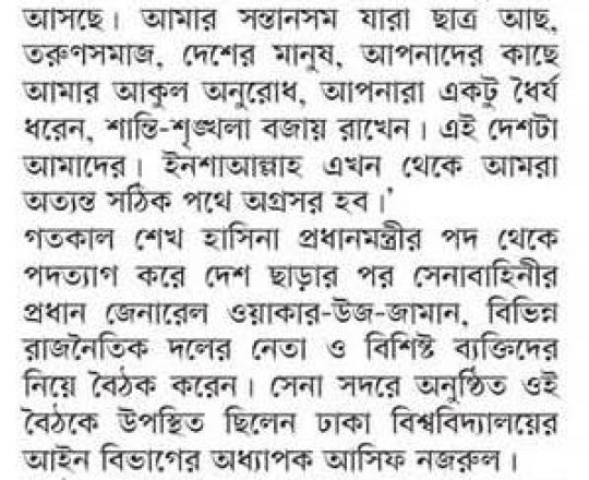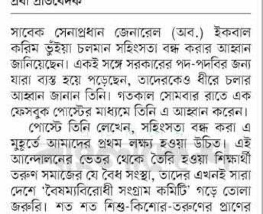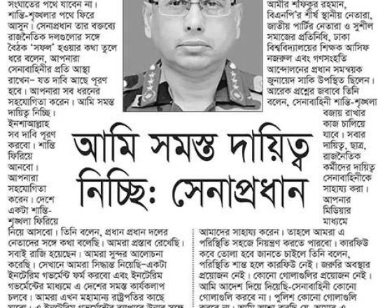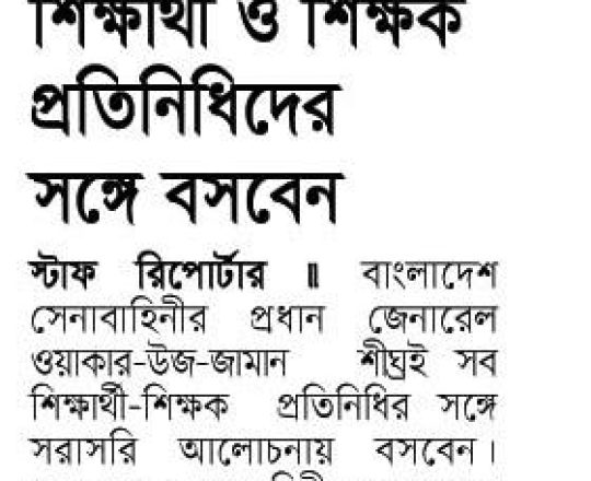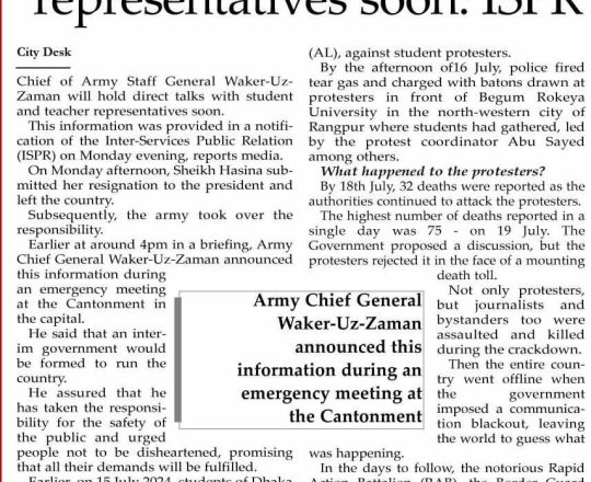 প্রথম আলো,৬ আগস্ট ছাত্র-শিক্ষক প্রতিনিধিদের সঙ্গে বসবেন সেনাপ্রধান