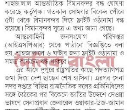 শেয়ার বিজ, ৬ আগস্ট ২০২৪, শাহজালাল আন্তর্জাতিক বিমানবন্দর বন্ধ ঘোষণা