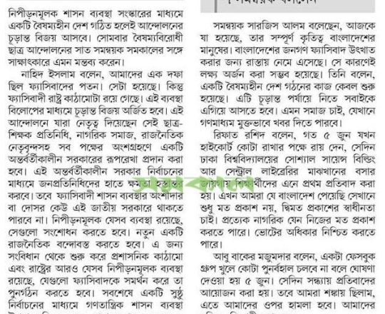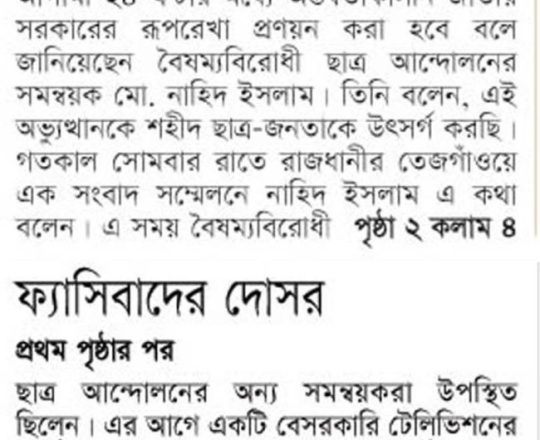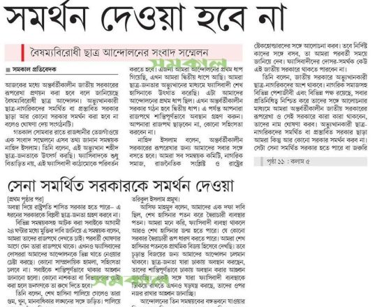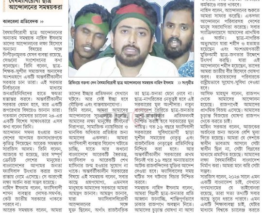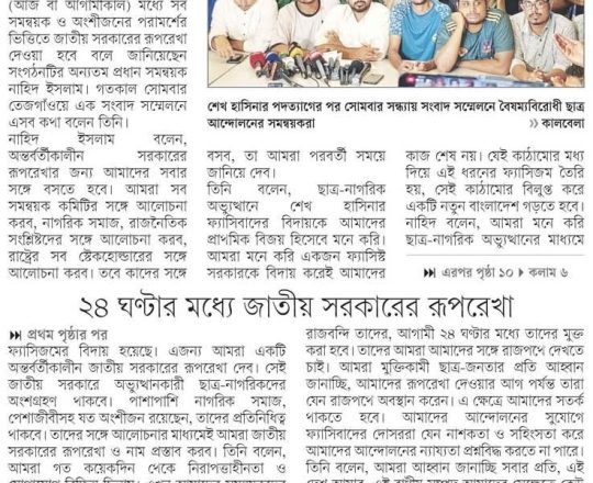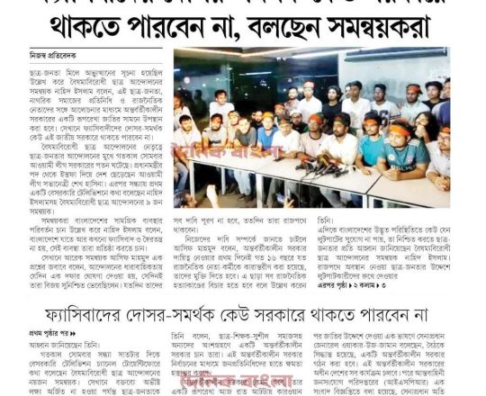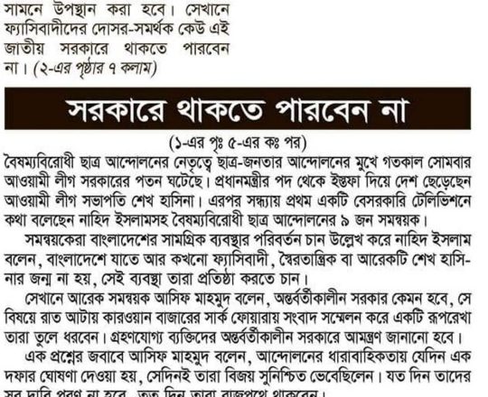 প্রথম আলো,৬ আগস্ট ফ্যাসিবাদের দোসর-সমর্থক কেউ সরকারে থাকতে পারবেন না, বলছেন সমন্বয়কেরা