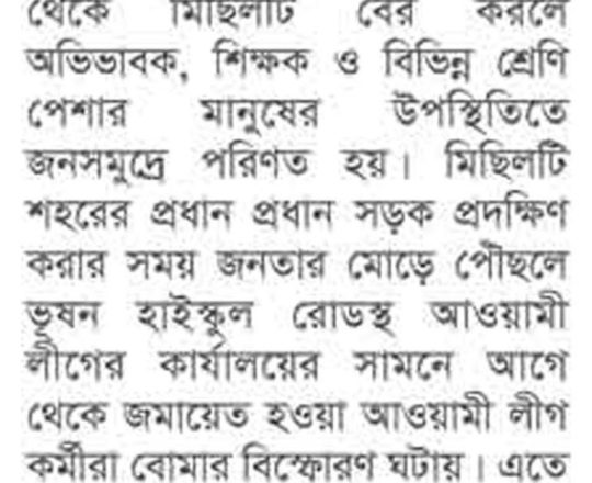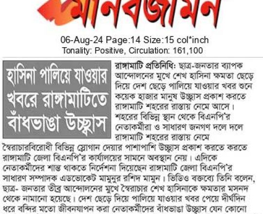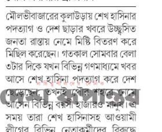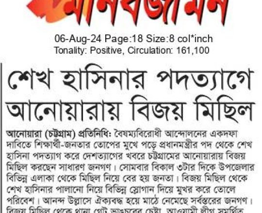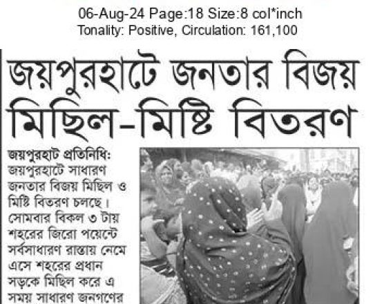 Daily Observer, 6 August 2024, Thousands of people from all walks of life took part in the celebration of Sheikh Hasina's fall on Monday at Chattogram city