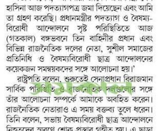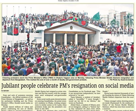 শেয়ার বিজ, ৬ আগস্ট ২০২৪, প্রধানমন্ত্রীর পদ থেকে পদত্যাগ করে শেখ হাসিনা