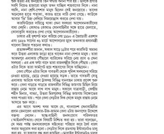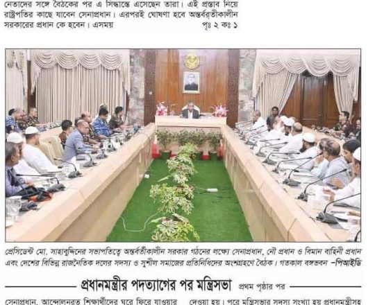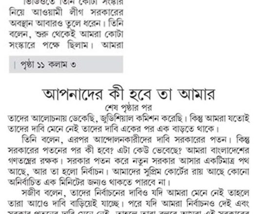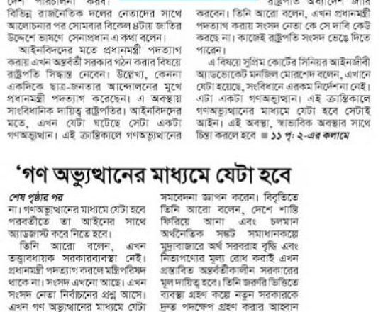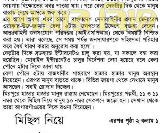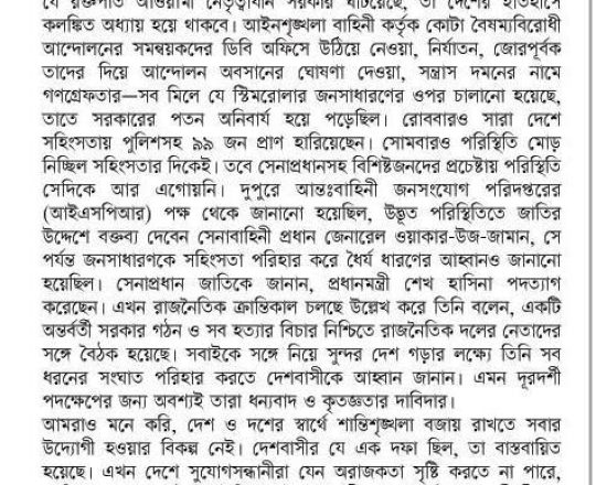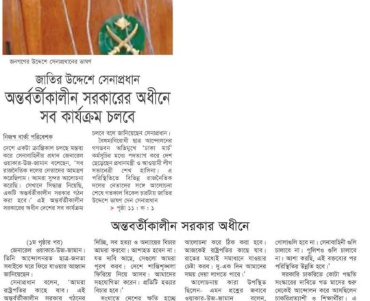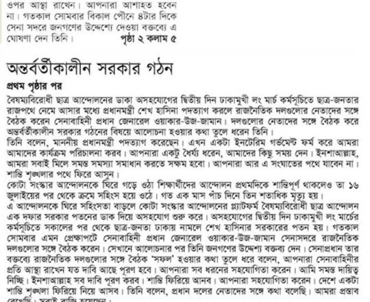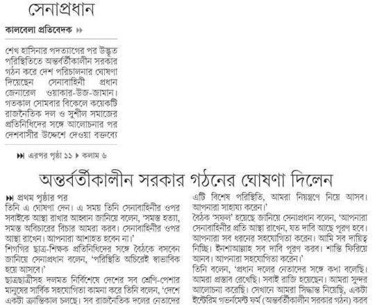 প্রথম আলো,৬ আগস্ট প্রধানমন্ত্রী পদত্যাগ করেছেন, হবে অন্তর্বর্তী সরকার: সেনাপ্রধান