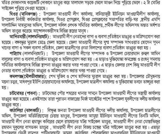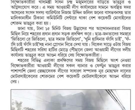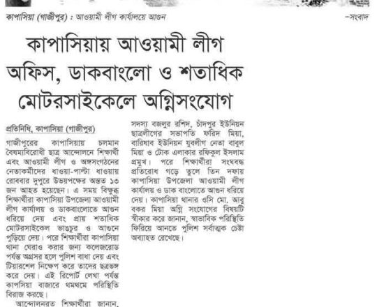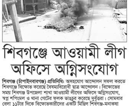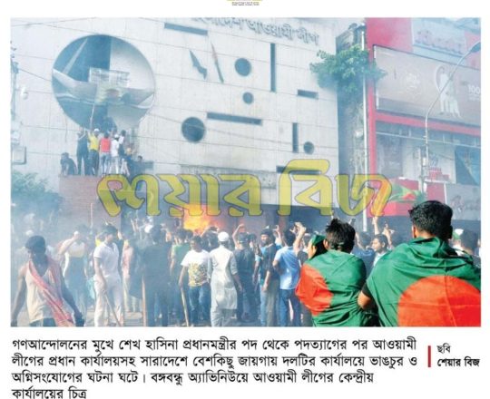 শেয়ার বিজ, ৬ আগস্ট ২০২৪, আওয়ামী লীগের প্রধান কার্যালয়সহ সারাদেশে বেশকিছু জায়গায় দলটির কার্যালয়ে ভাঙচুর ও অগ্নিসংযোগের ঘটনা ঘটে