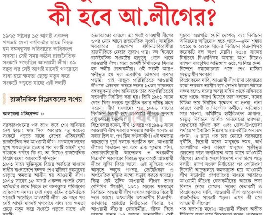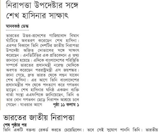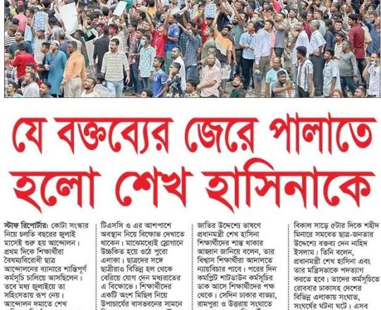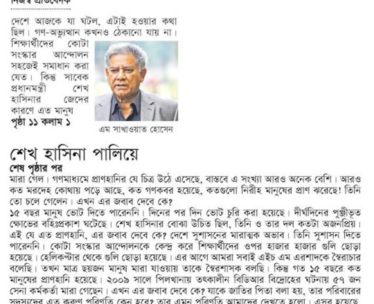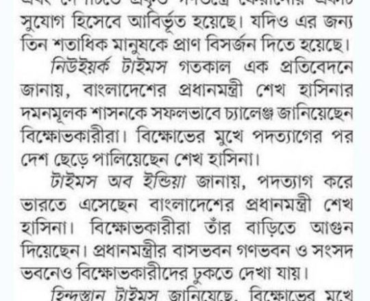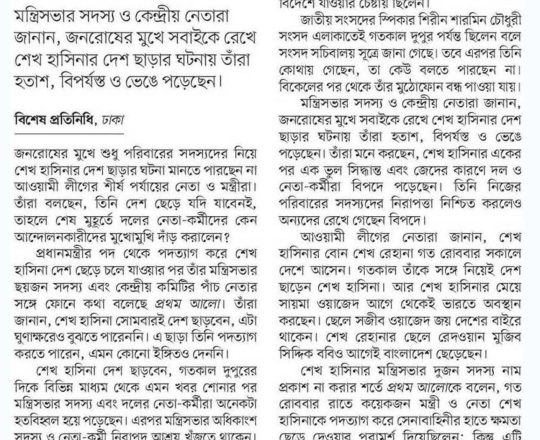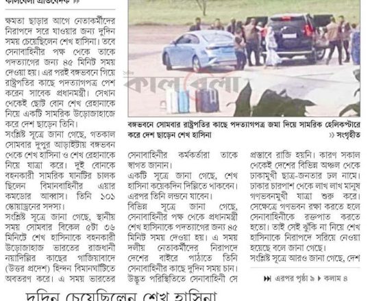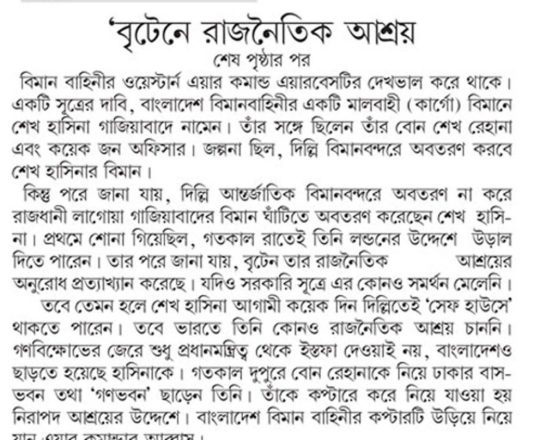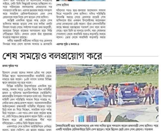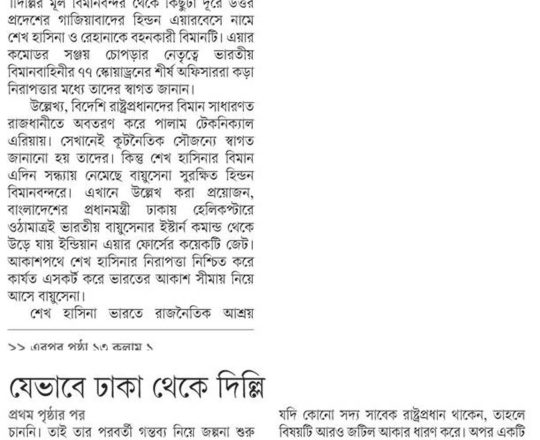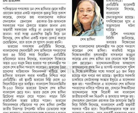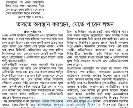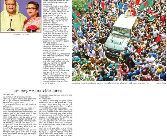 প্রথম আলো,৬ আগস্ট ক্ষমতাচুাত শেখ হাসিনার দেশত্যাগ, ভারতের জন্য কী বার্তা