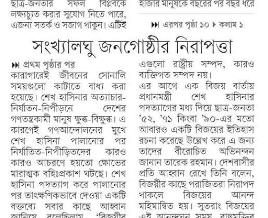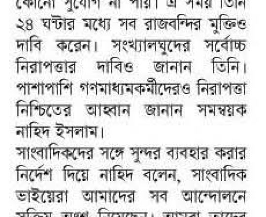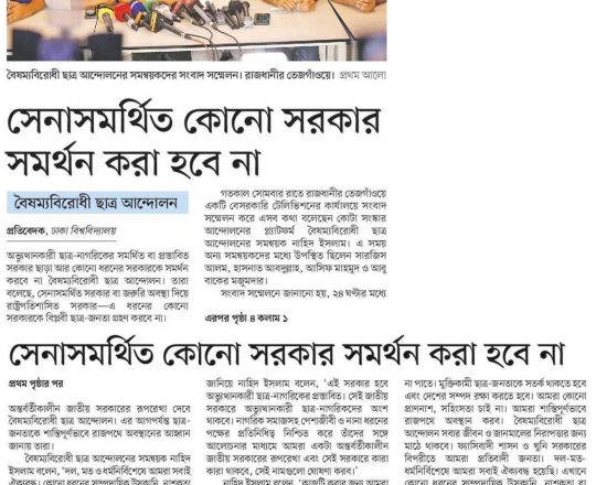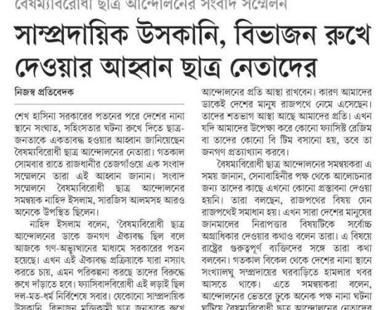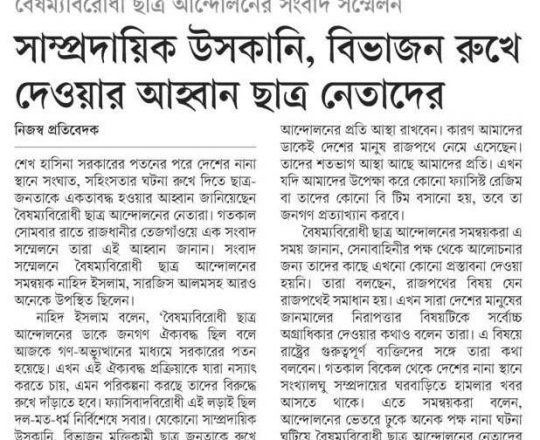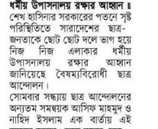 প্রথম আলো,৬ আগস্ট সংখ্যালঘু ও গণমাধ্যমকর্মীদের ওপর আঘাত প্রতিরোধের আহ্বান দুই সমন্বয়কের