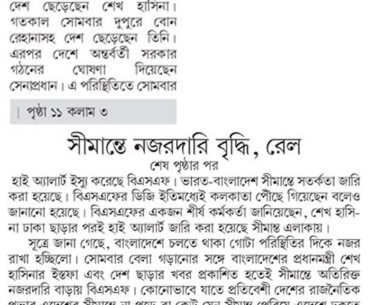 সংগ্রাম, ৬ আগস্ট ২০২৪, ভারত-বাংলাদেশ সীমান্তে নজরদারি বৃদ্ধি । কলকাতায় বিএসএফ ডিজি