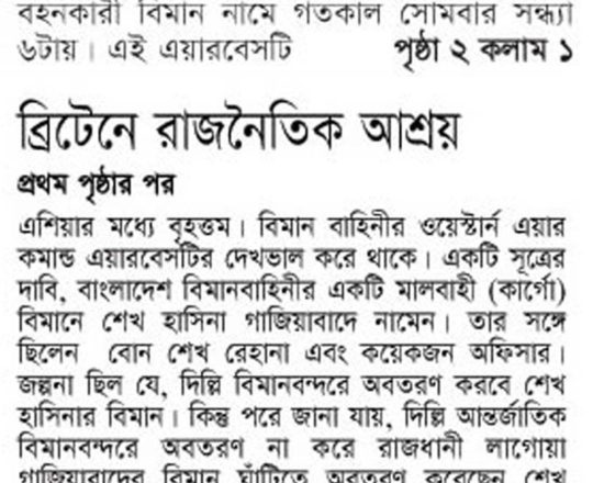 প্রথম আলো,৬ আগস্ট ভারতের হিন্দন বিমানঘাঁটিতে পৌঁছালেন দেশত্যাগী শেখ হাসিনা