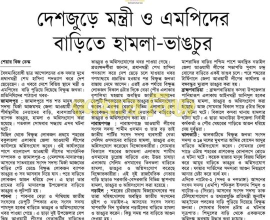 শেয়ার বিজ, ৬ আগস্ট ২০২৪, দেশজুড়ে মন্ত্রী ও এমপিদের বাড়িতে হামলা-ভাঙচুর
