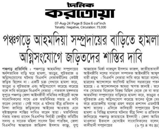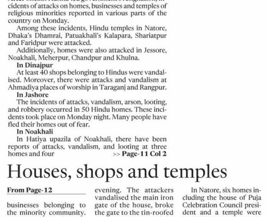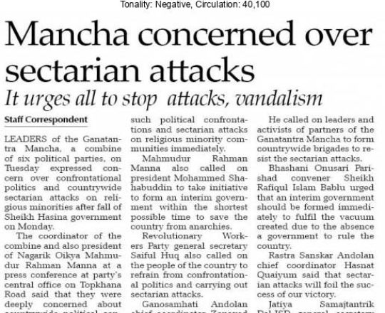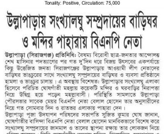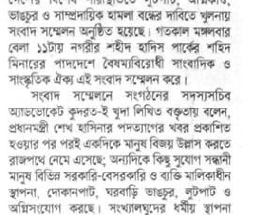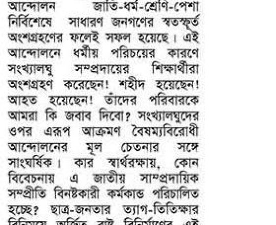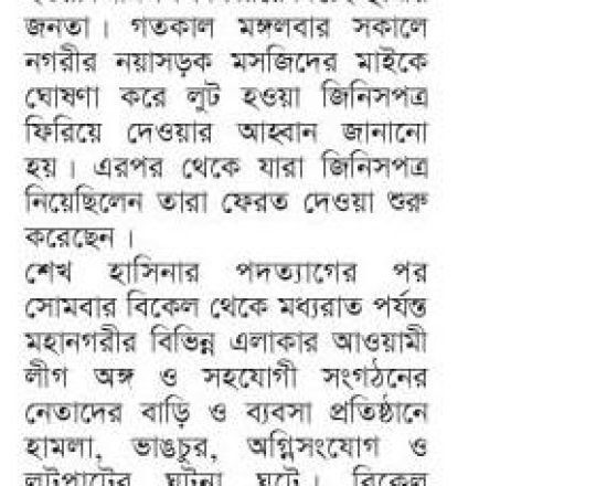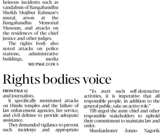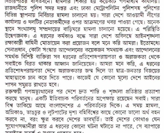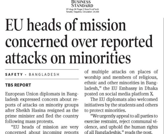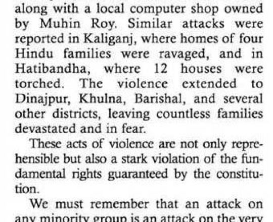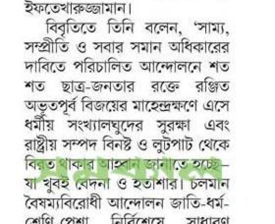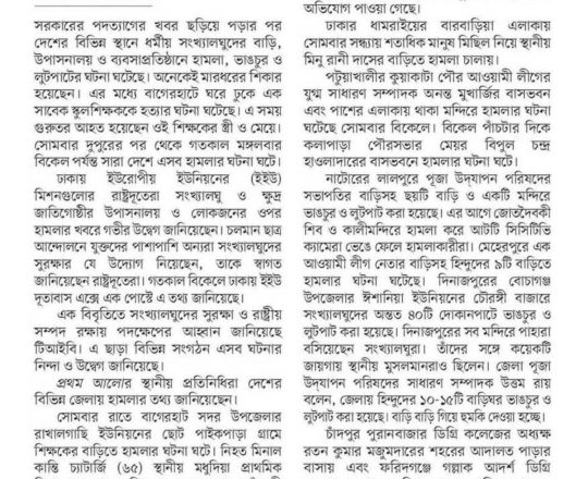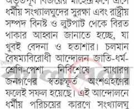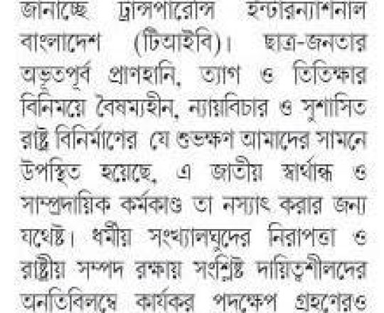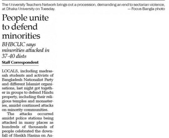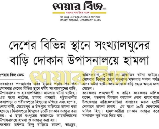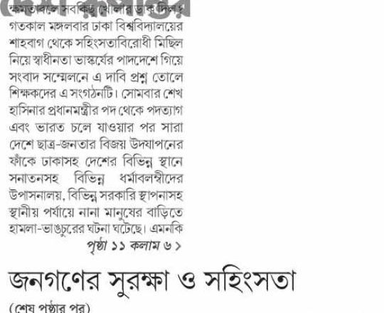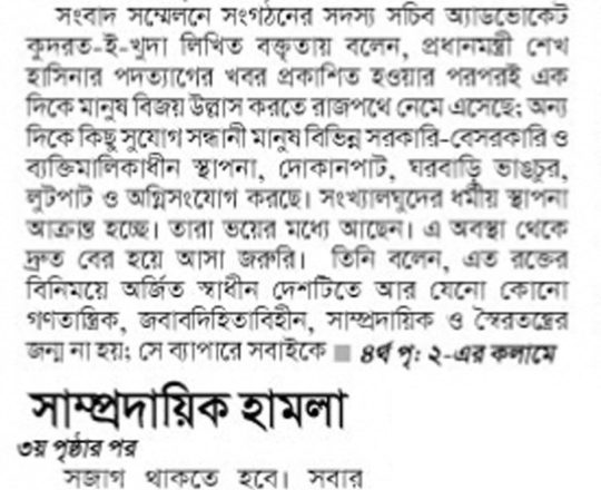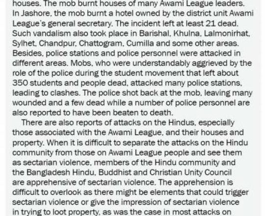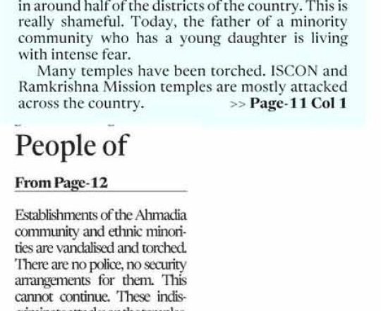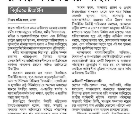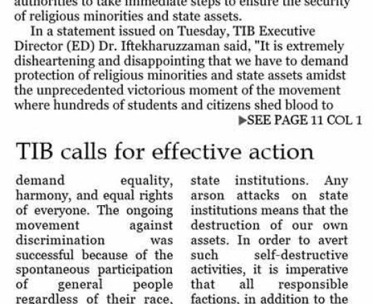 Asian Age, 7 August 2024, TIB calls for effective action to protect minorities and state property