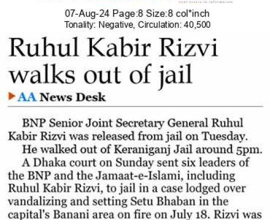 Asian Age, 7 August 2024, Ruhul Kabir Rizvi walks out of jail