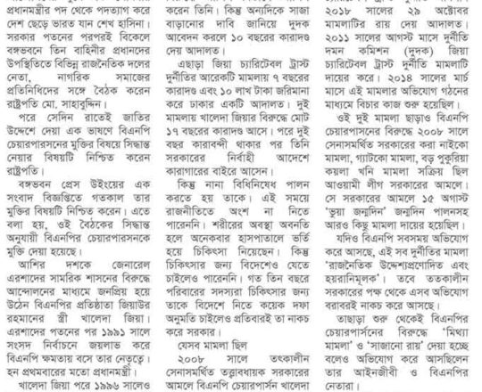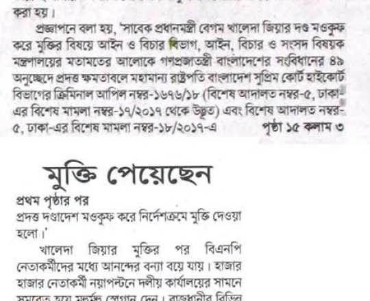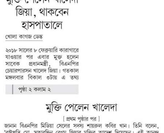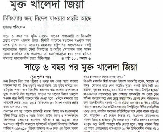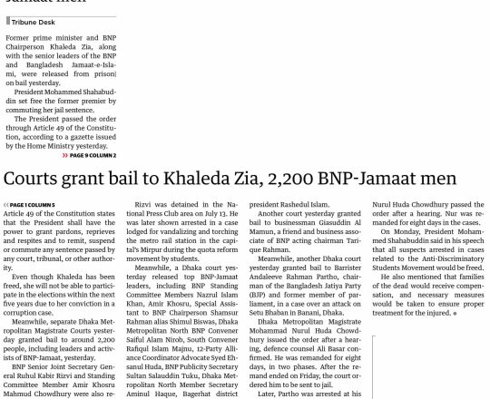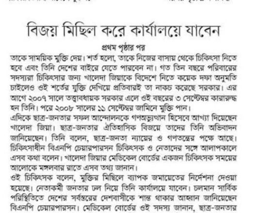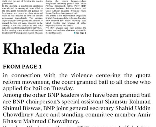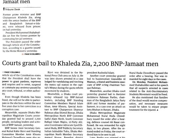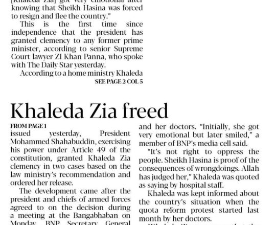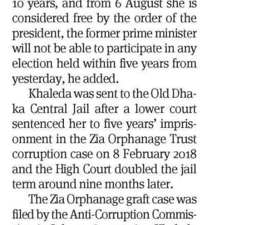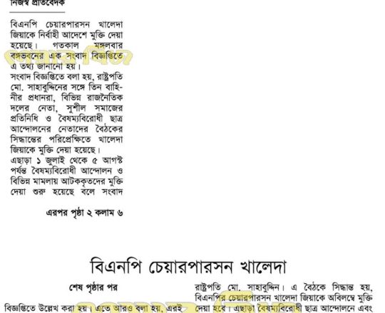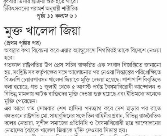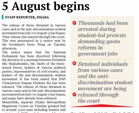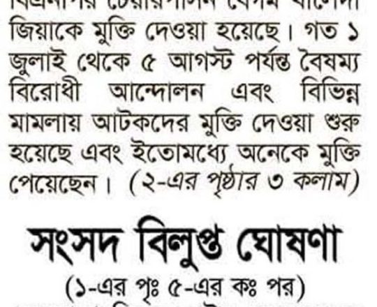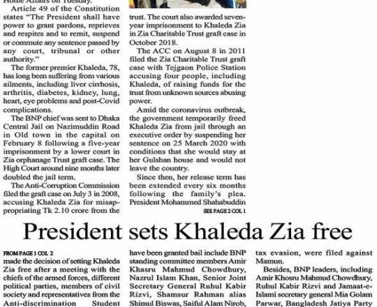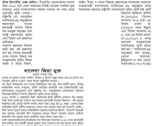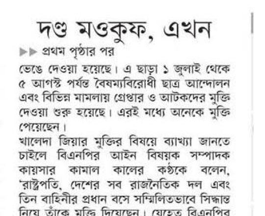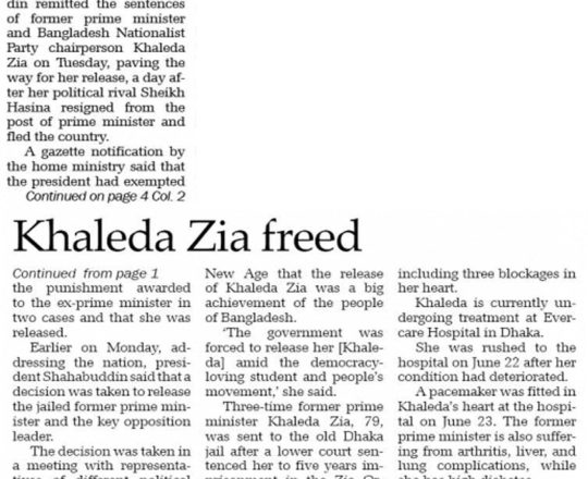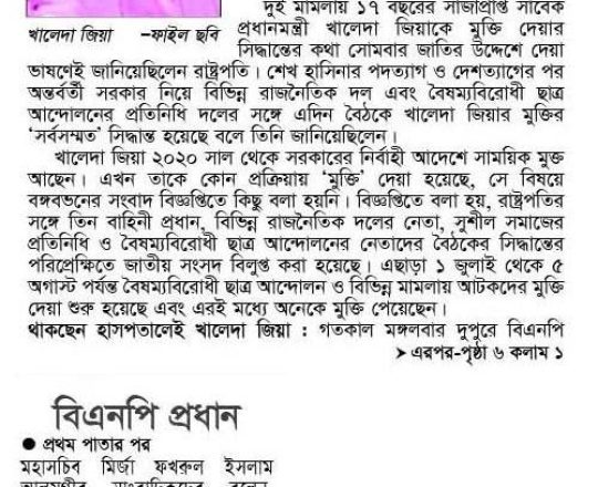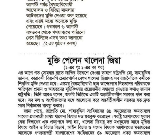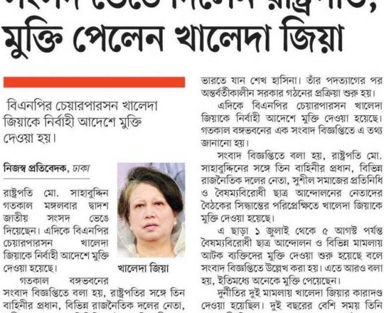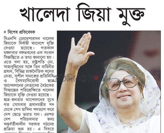 Bangladesh Post, 7 August 2024, President sets Khaleda Zia free