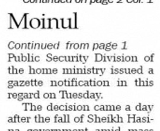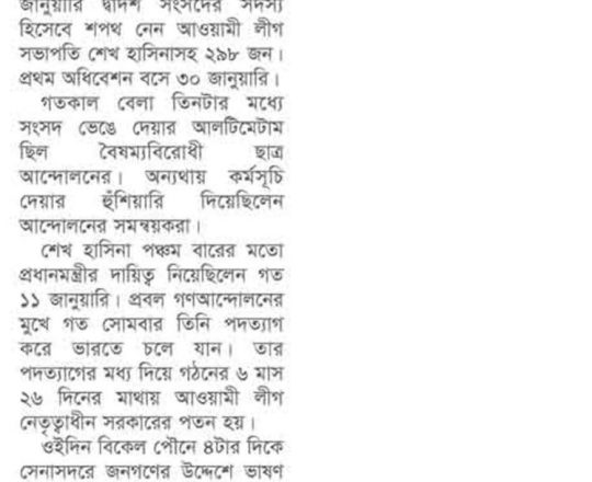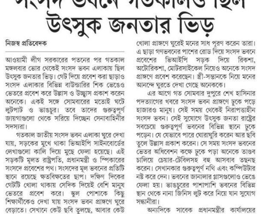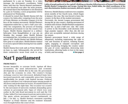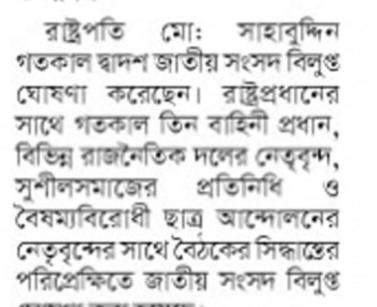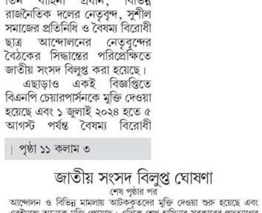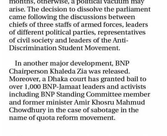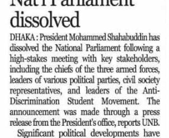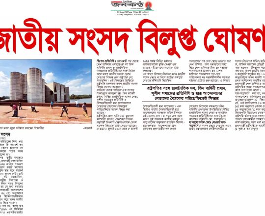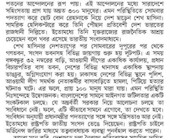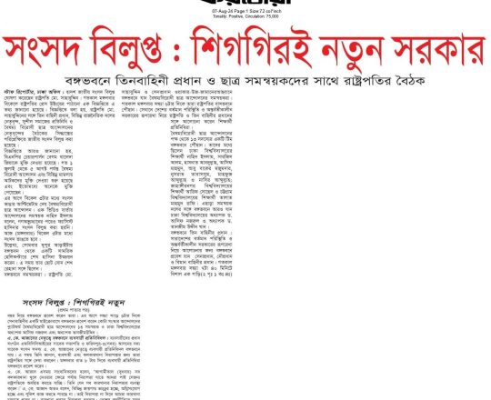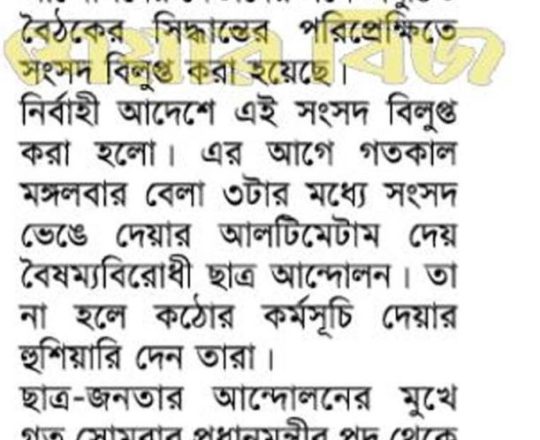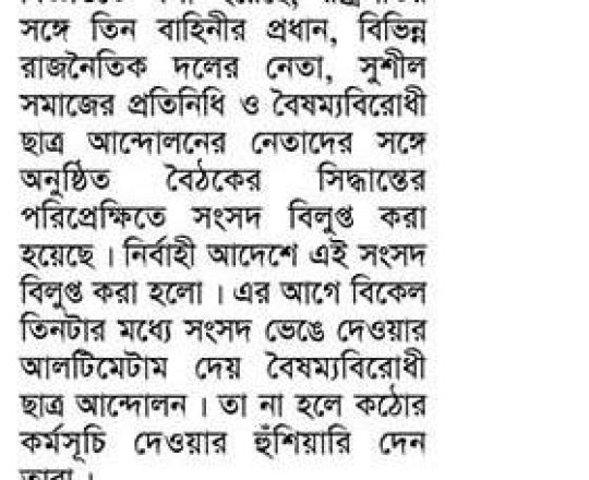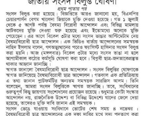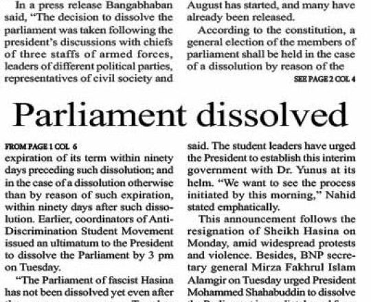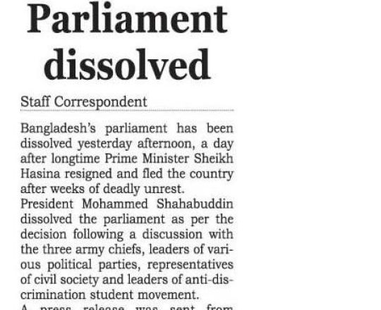 Bangladesh Post, 7 August 2024, Parliament dissolved