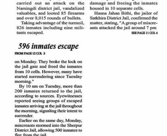 Bangladesh Post, 7 August 2024, 596 inmates escape in Satkhira jailbreak Over 200 voluntarily surrender
