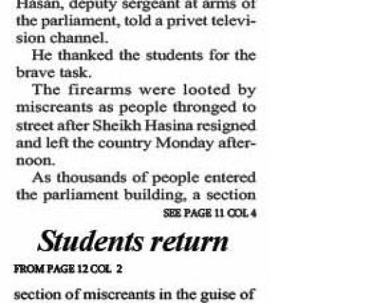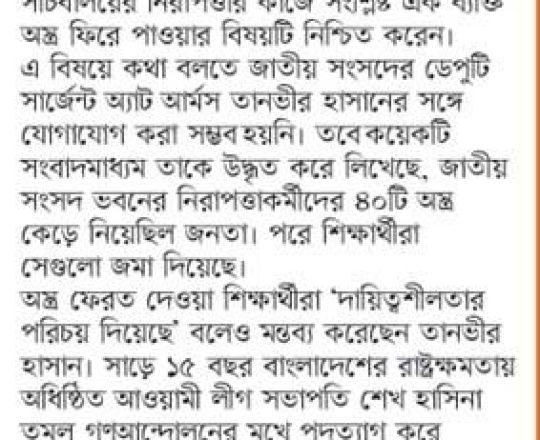 Bangladesh Post, 7 August 2024, Students return 40 firearms looted by miscreants from JS Bhaban