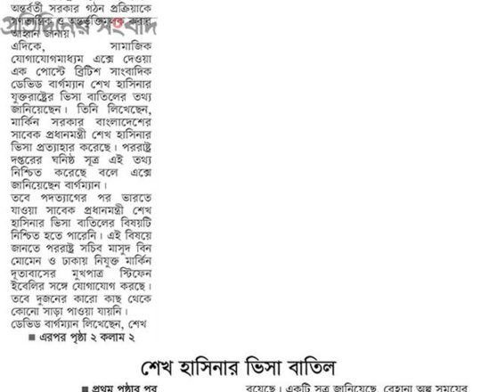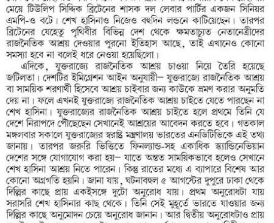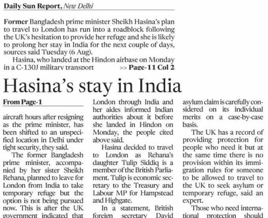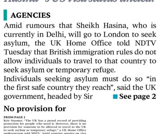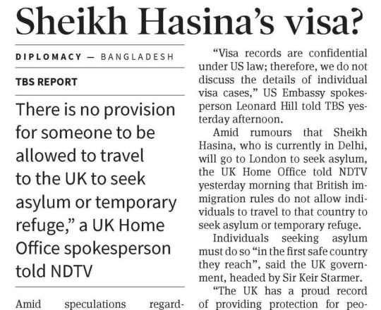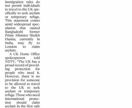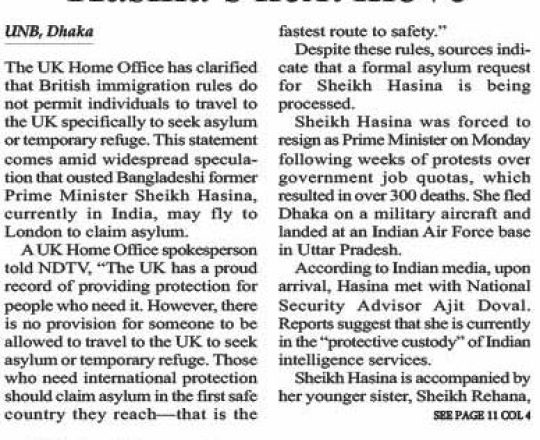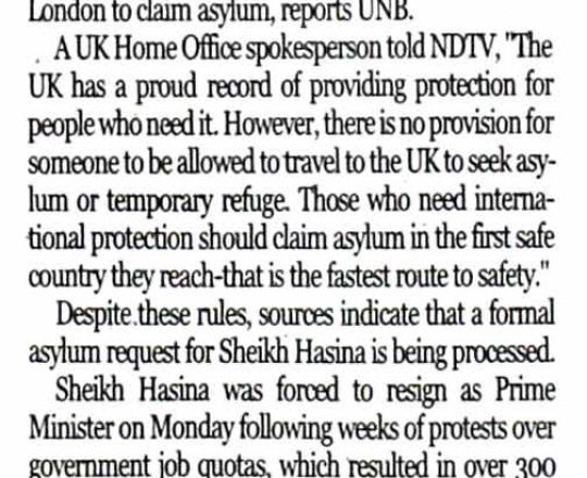 Bangladesh Post, 7 August 2024, UK clarifies asylum rules amid speculation on Hasina's next move