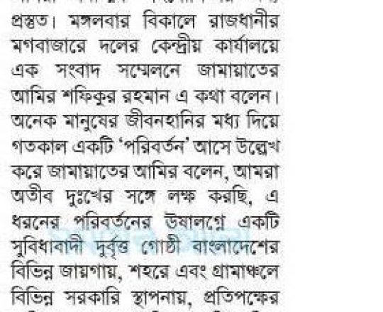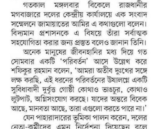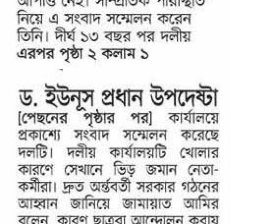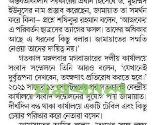 বাংলাদেশ প্রতিদিন, ৭ আগস্ট ২০২৪, ড. ইউনূস প্রধান উপদেষ্টা হলে আপত্তি নেই জামায়াতের