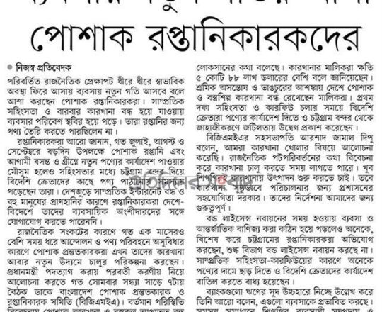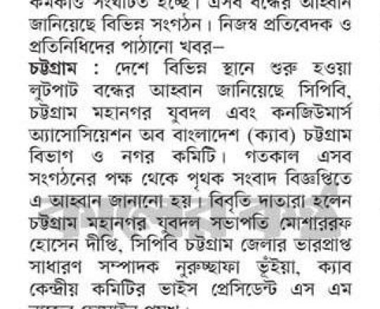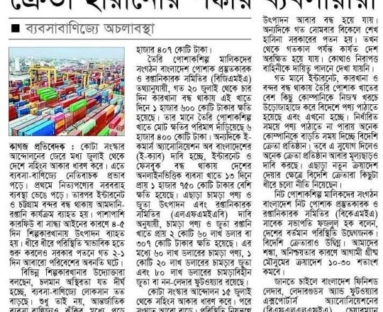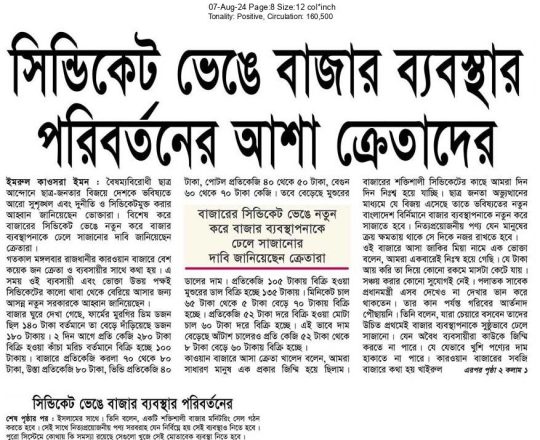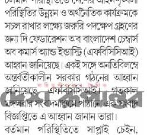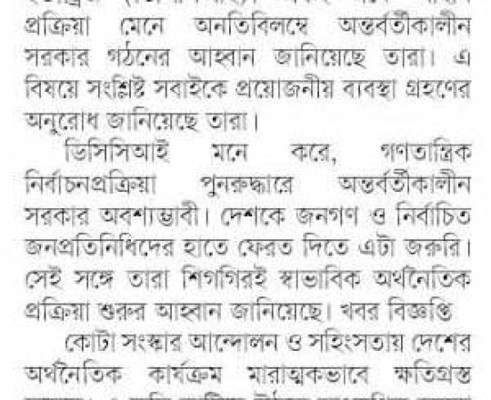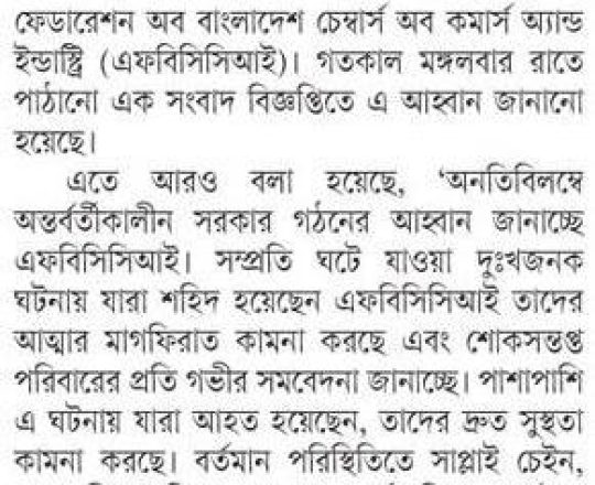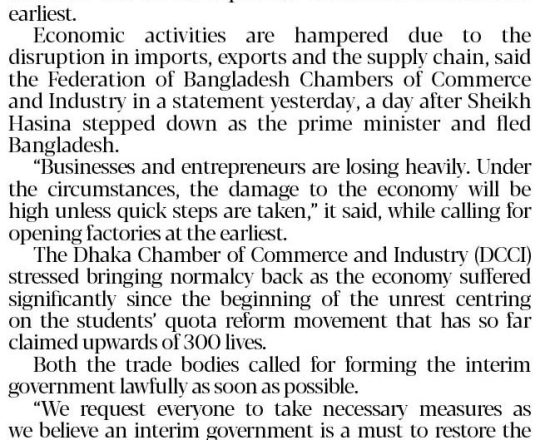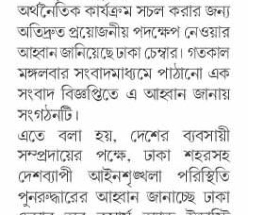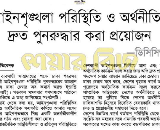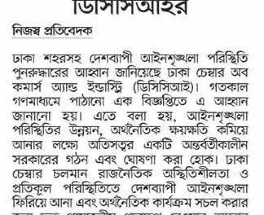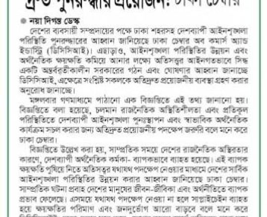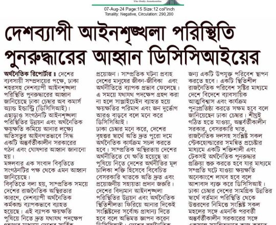 বাংলাদেশ প্রতিদিন, ৭ আগস্ট ২০২৪, আইনশৃঙ্খলা পরিস্থিতি পুনরুদ্ধারের আহ্বান ডিসিসিআইর
