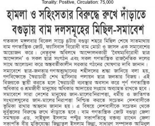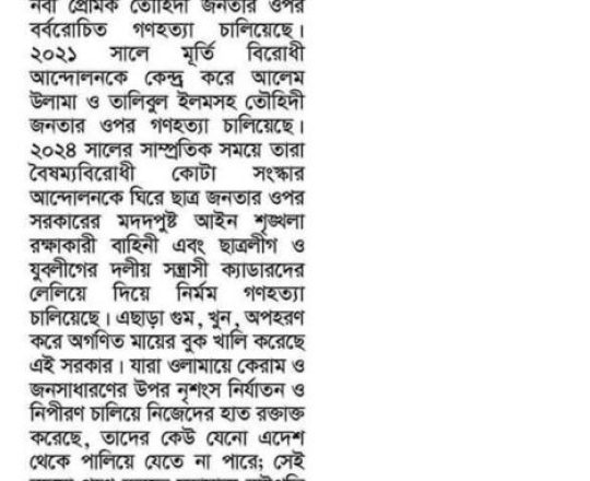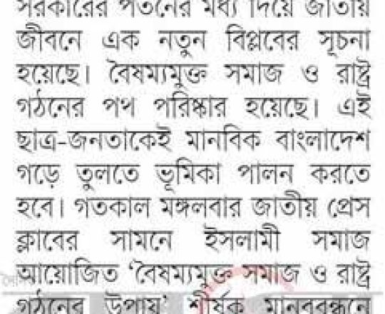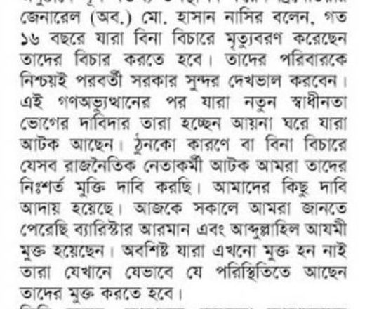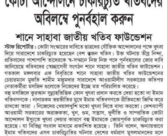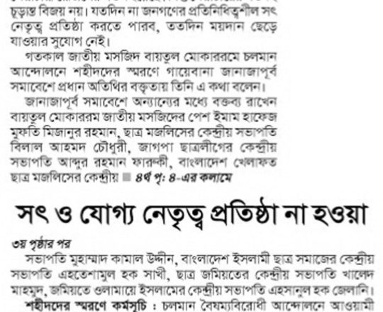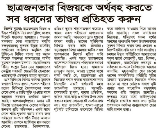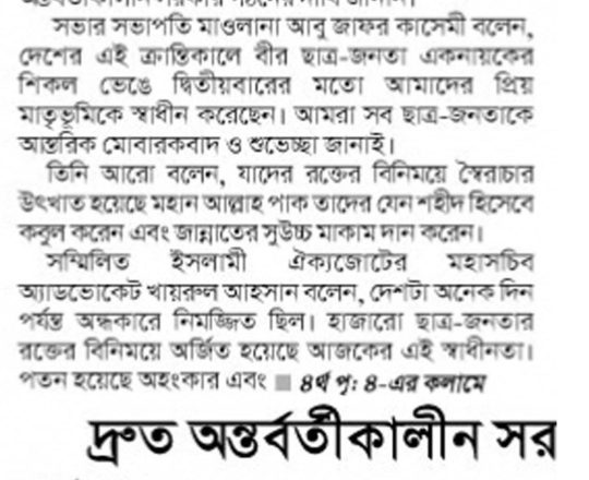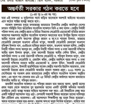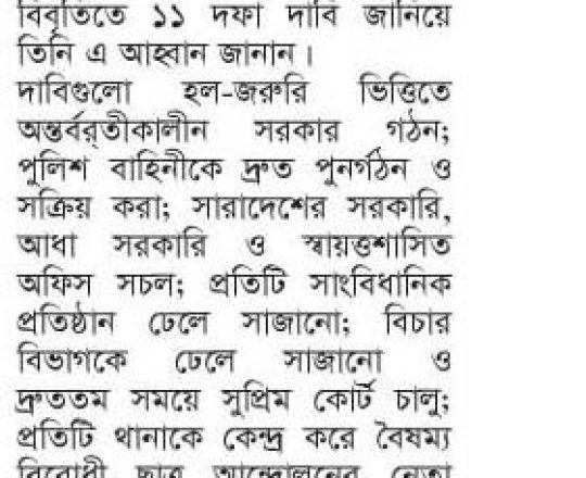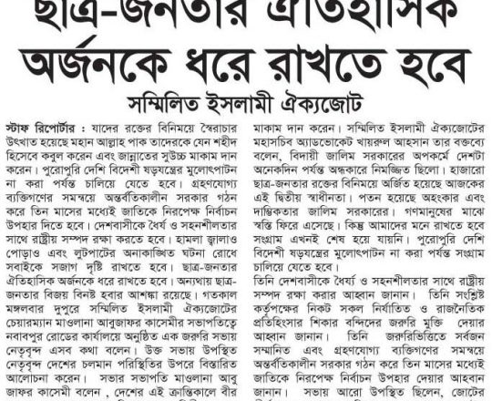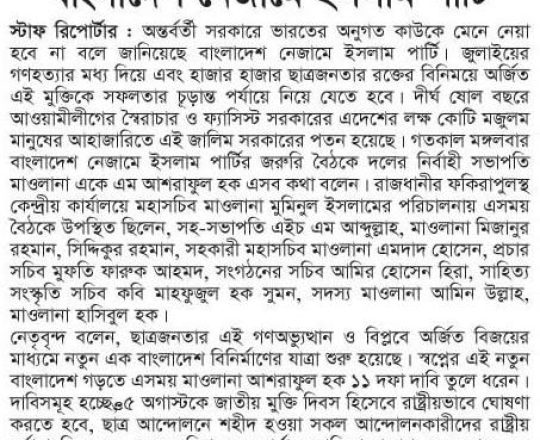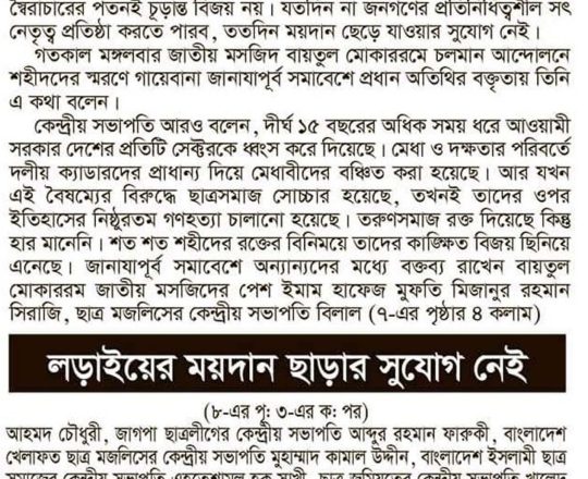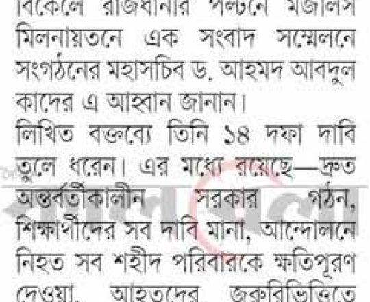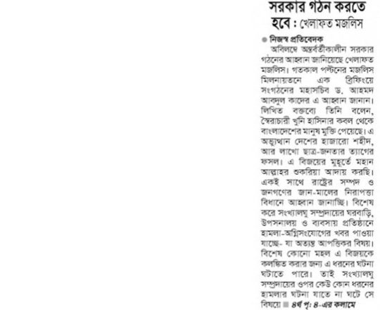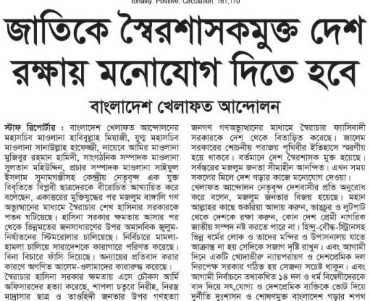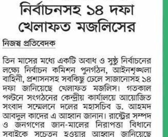 বাংলাদেশ প্রতিদিন, ৭ আগস্ট ২০২৪, তিন মাসের মধ্যে নির্বাচনসহ ১৪ দফা খেলাফত মজলিসের
