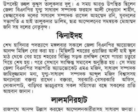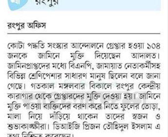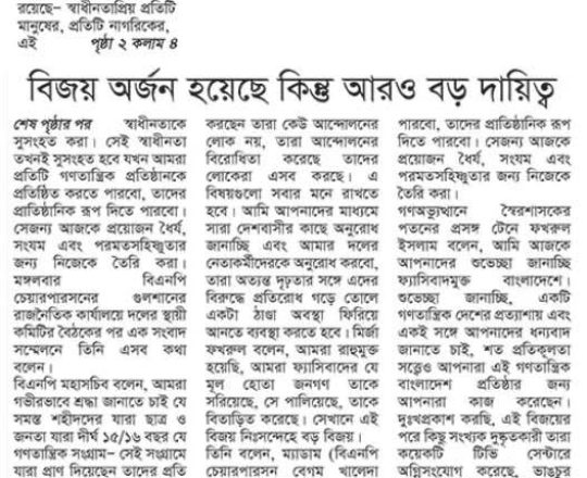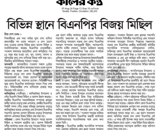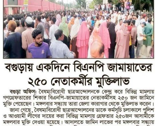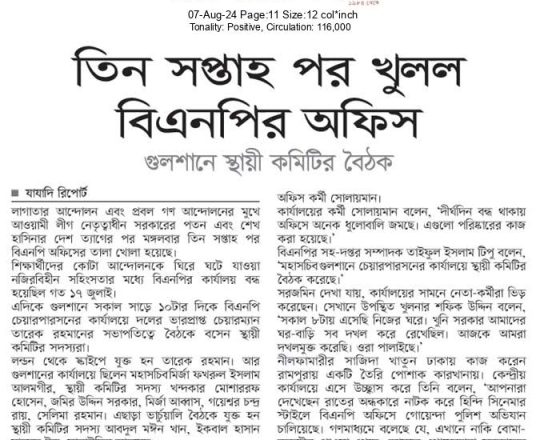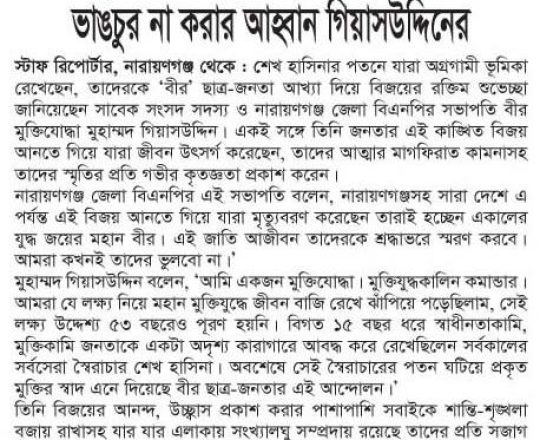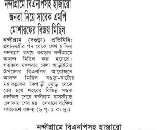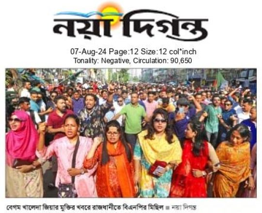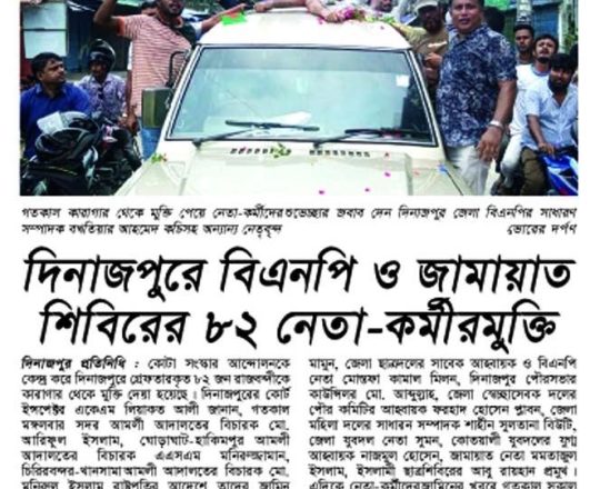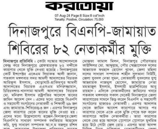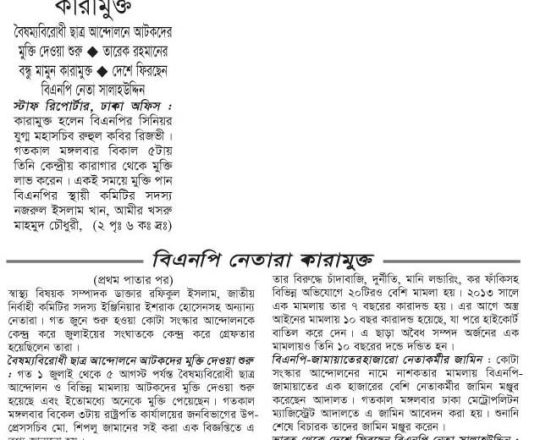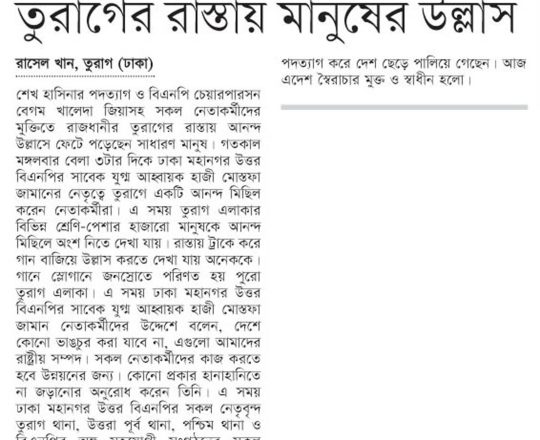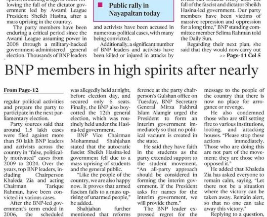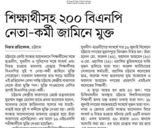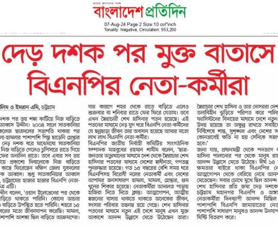 বাংলাদেশ প্রতিদিন, ৭ আগস্ট ২০২৪, দেড় দশক পর মুক্ত বাতাসে বিএনপির নেতা-কর্মীরা