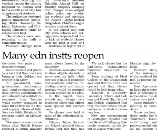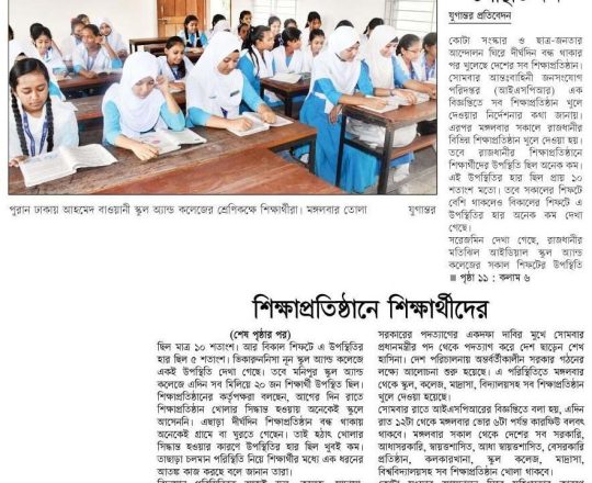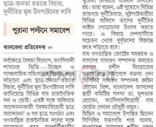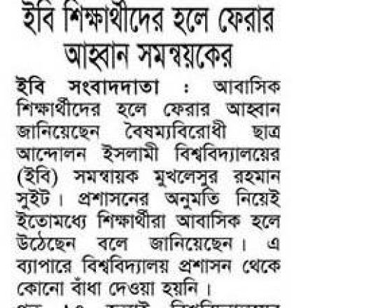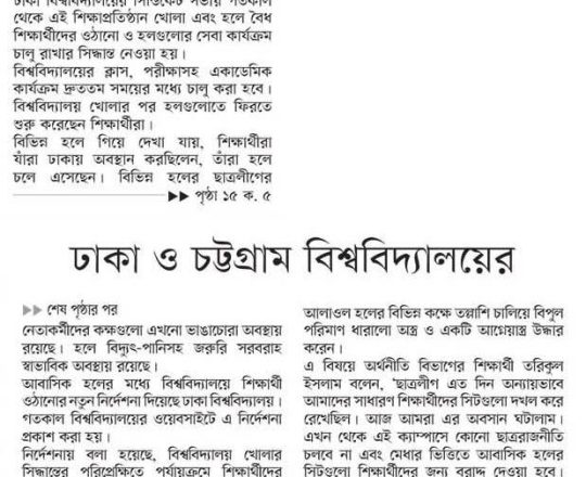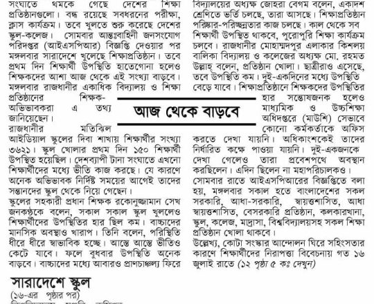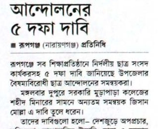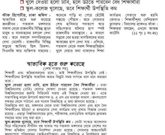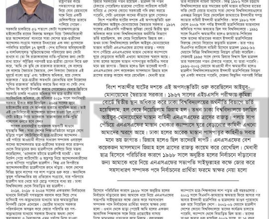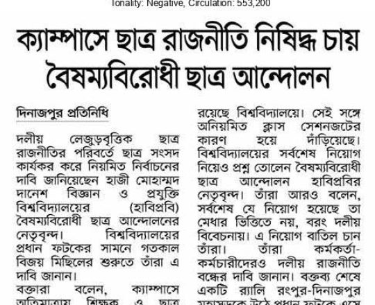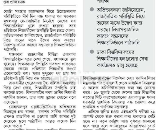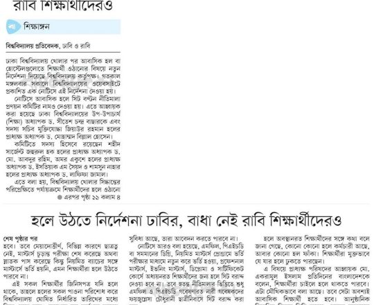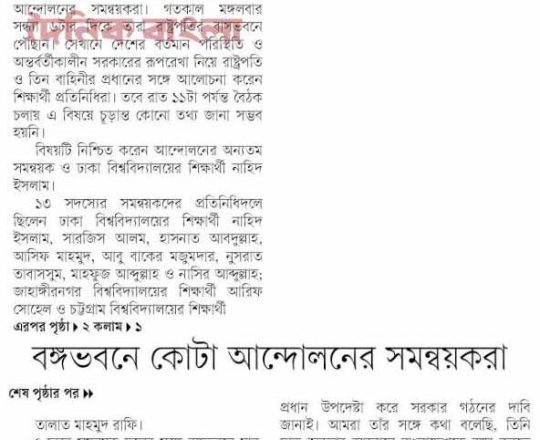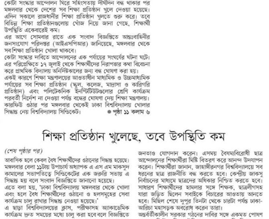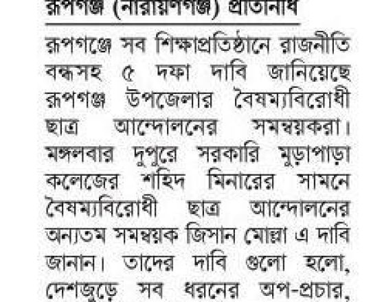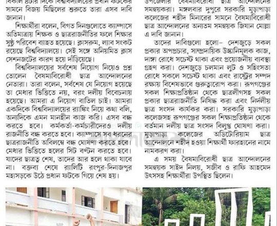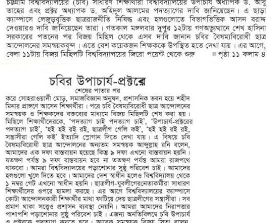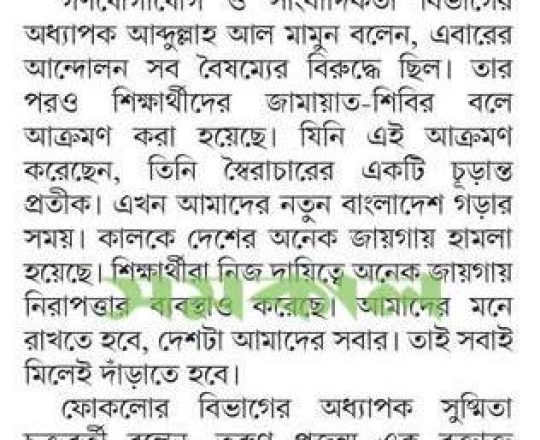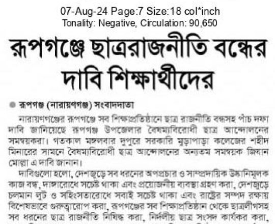 বাংলাদেশ প্রতিদিন, ৭ আগস্ট ২০২৪, ক্যাম্পাসে ছাত্র রাজনীতি নিষিদ্ধ চায় বৈষম্যবিরোধী ছাত্র আন্দোলন