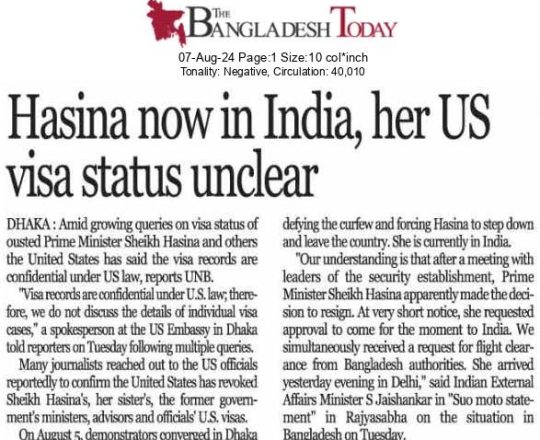 Bangladesh Today, 7 August 2024, Hasina now in India, her US visa status unclear