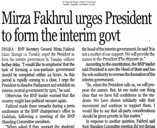 Bangladesh Today, 7 August 2024, Mirza Fakhrul urges President to form the interim govt