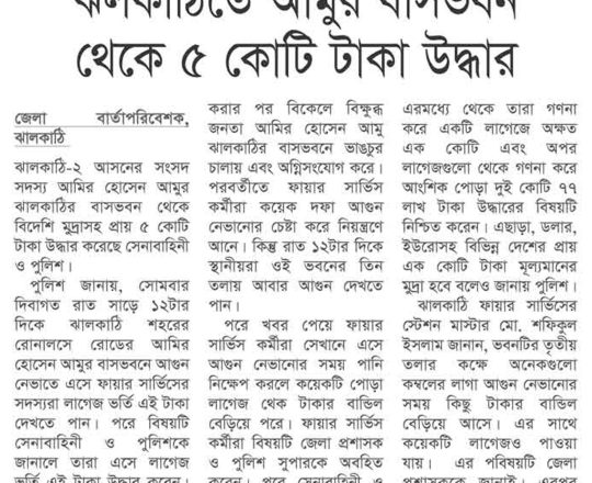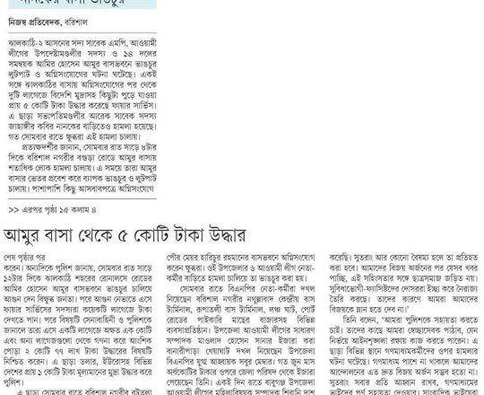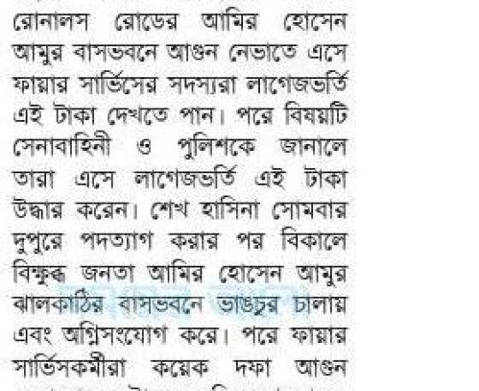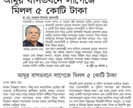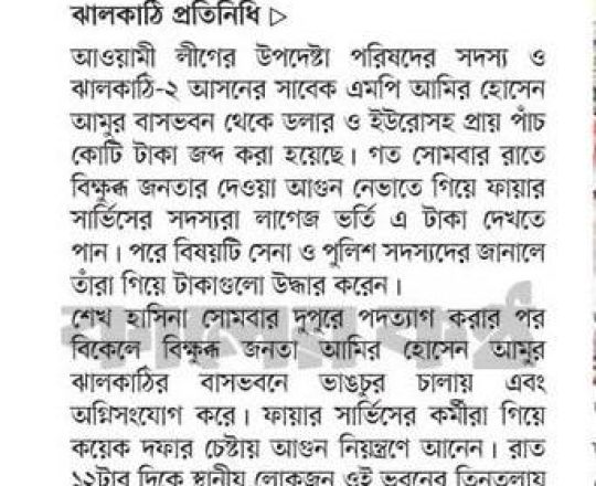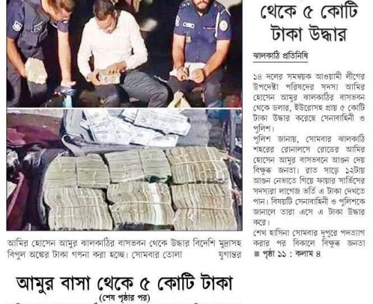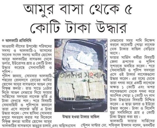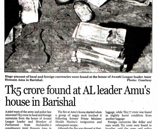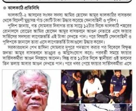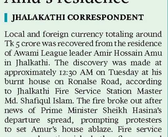 সময়ের আলো, ৭ আগস্ট ২০২৪, আমুর ঝালকাঠির বাসভবন থেকে ৫ কোটি টাকা উদ্ধার