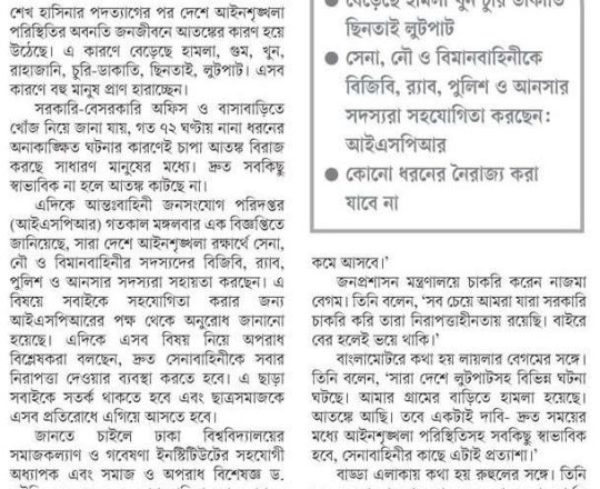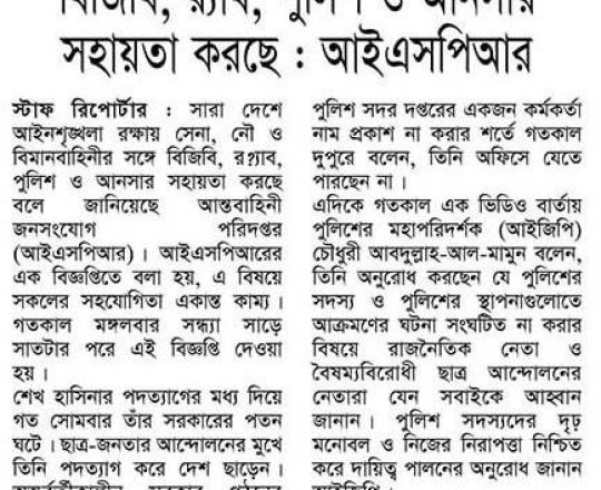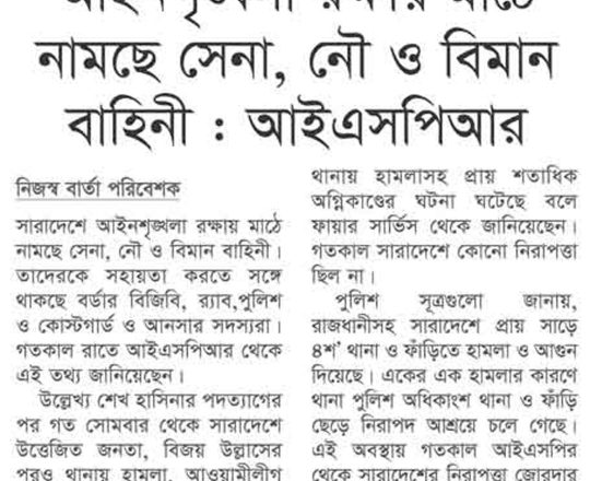 ভোরের ডাক, ৭ আগস্ট ২০২৪, আইনশৃঙ্খলা রক্ষায় তিন বাহিনীর সঙ্গে বিজিবি, র্যাব, পুলিশ ও আনসার সহায়তা করছে: আইএসপিআর
