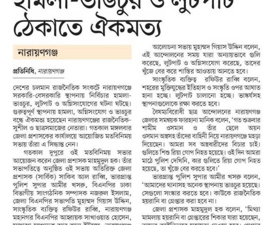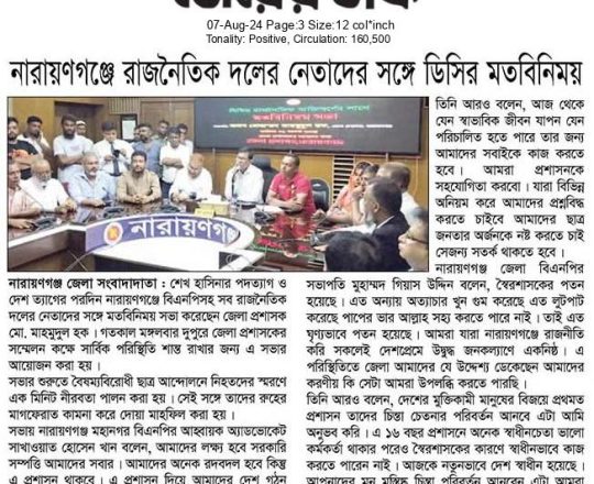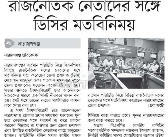 ভোরের ডাক, ৭ আগস্ট ২০২৪, নারায়ণগঞ্জে রাজনৈতিক দলের নেতাদের সঙ্গে ডিসির মতবিনিময়