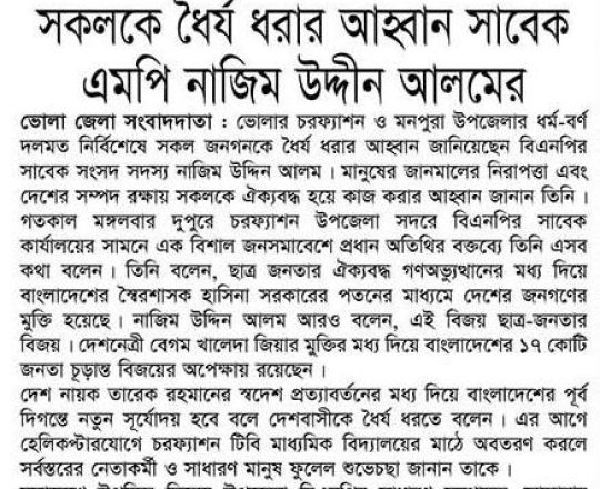 ভোরের ডাক, ৭ আগস্ট ২০২৪, সকলকে ধৈর্য ধরার আহ্বান সাবেক এমপি নাজিম উদ্দীন আলমের