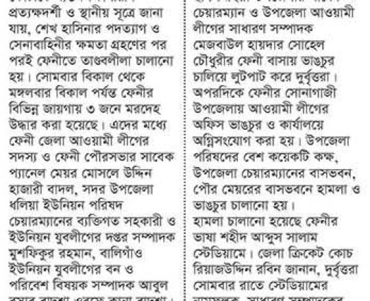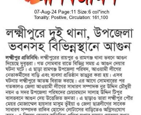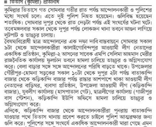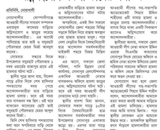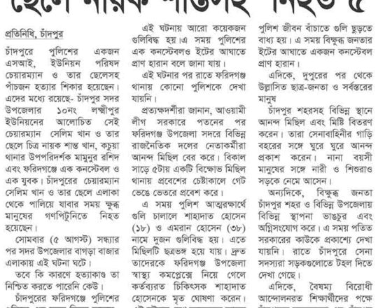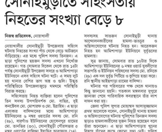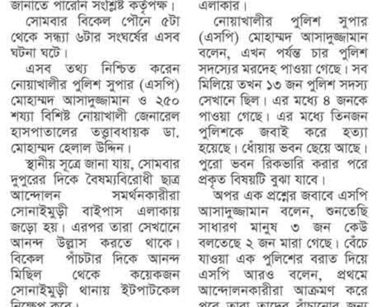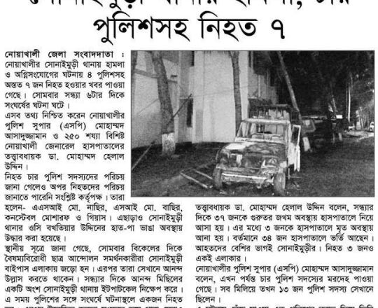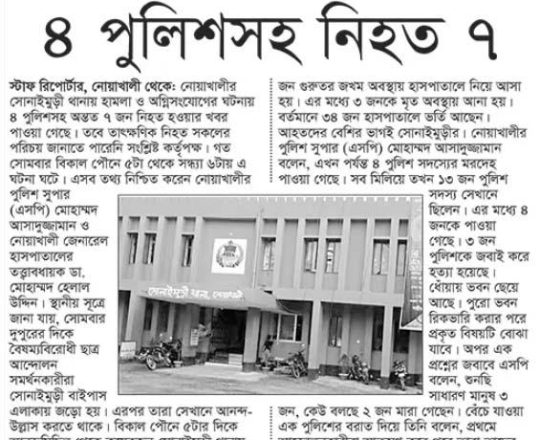 সময়ের আলো, ৭ আগস্ট ২০২৪, নোয়াখালীতে ৪ পুলিশসহ নিহত ৭