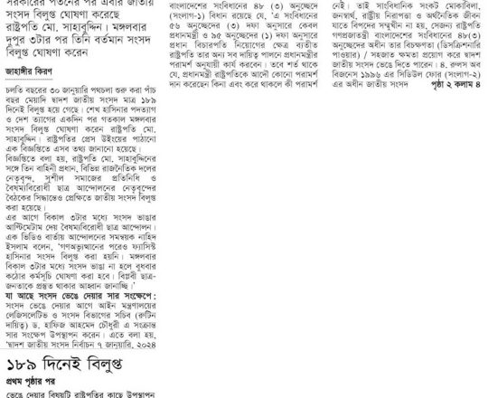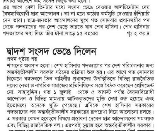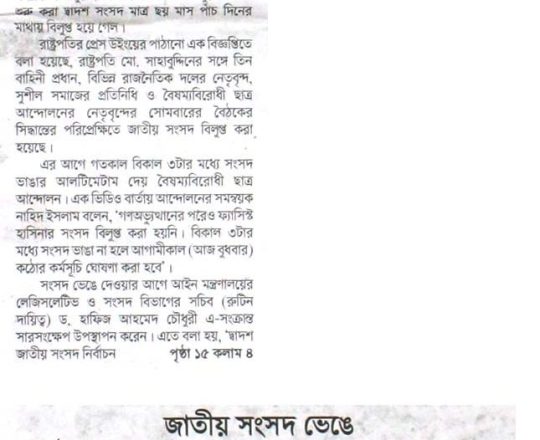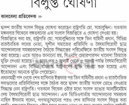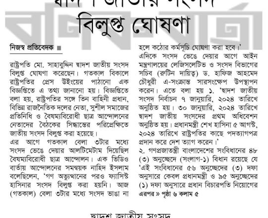 ভোরের ডাক, ৭ আগস্ট ২০২৪, দ্বাদশ সংসদ বিলুপ্ত
