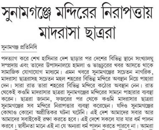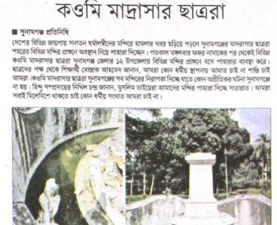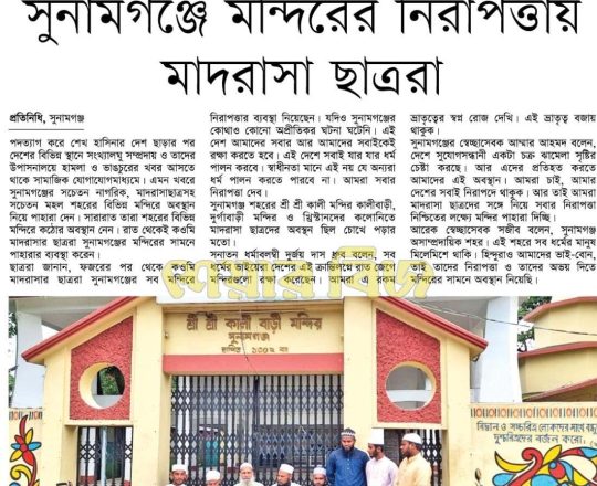শেয়ার বিজ, ৭ আগস্ট ২০২৪, সুনামগঞ্জে মন্দিরের নিরাপত্তায় মাদরাসা ছাত্ররা
