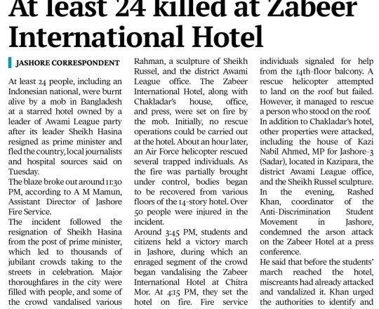 সময়ের আলো, ৭ আগস্ট ২০২৪, অগ্নিসংযোগের ঘটনায় মৃতের সংখ্যা বেড়ে ২৪