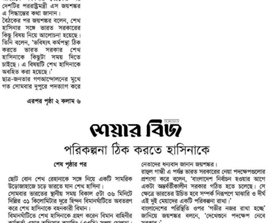 শেয়ার বিজ, ৭ আগস্ট ২০২৪, পরিকল্পনা ঠিক করতে হাসিনাকে 'সময় দিতে চায়' ভারত