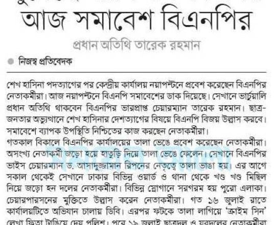 সময়ের আলো, ৭ আগস্ট ২০২৪, খুলেছে নয়াপল্টন কার্যালয় আজ সমাবেশ বিএনপির প্রধান অতিথি তারেক রহমান