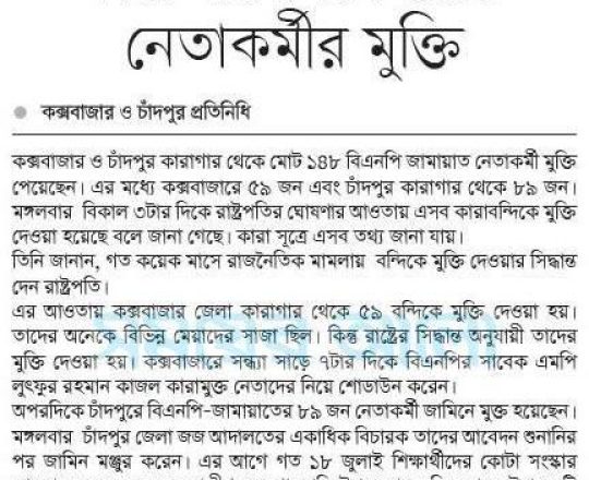 সময়ের আলো, ৭ আগস্ট ২০২৪, কক্সবাজার ও চাঁদপুর কারাগার থেকে ১৪৮ নেতাকর্মীর মুক্তি